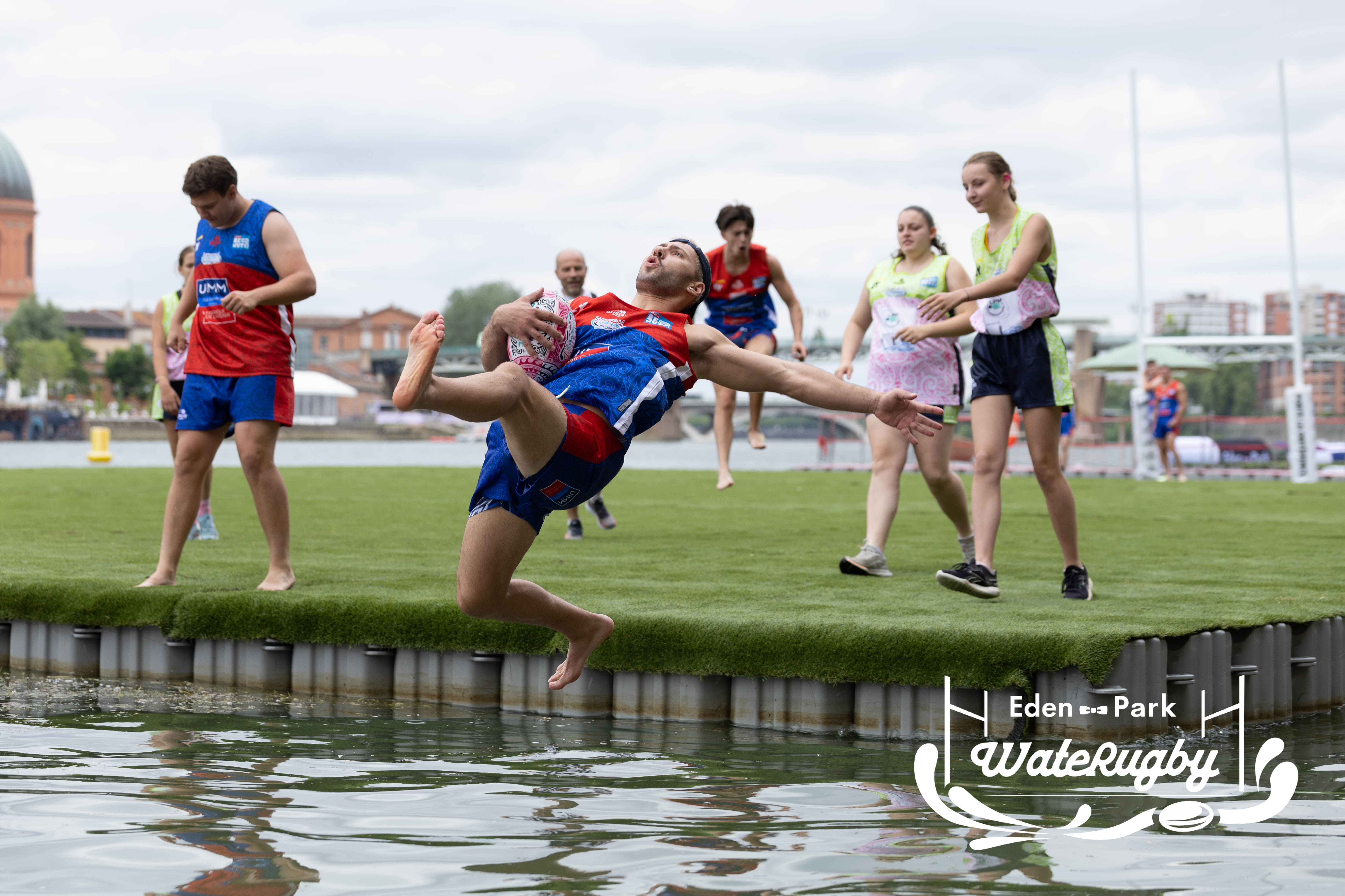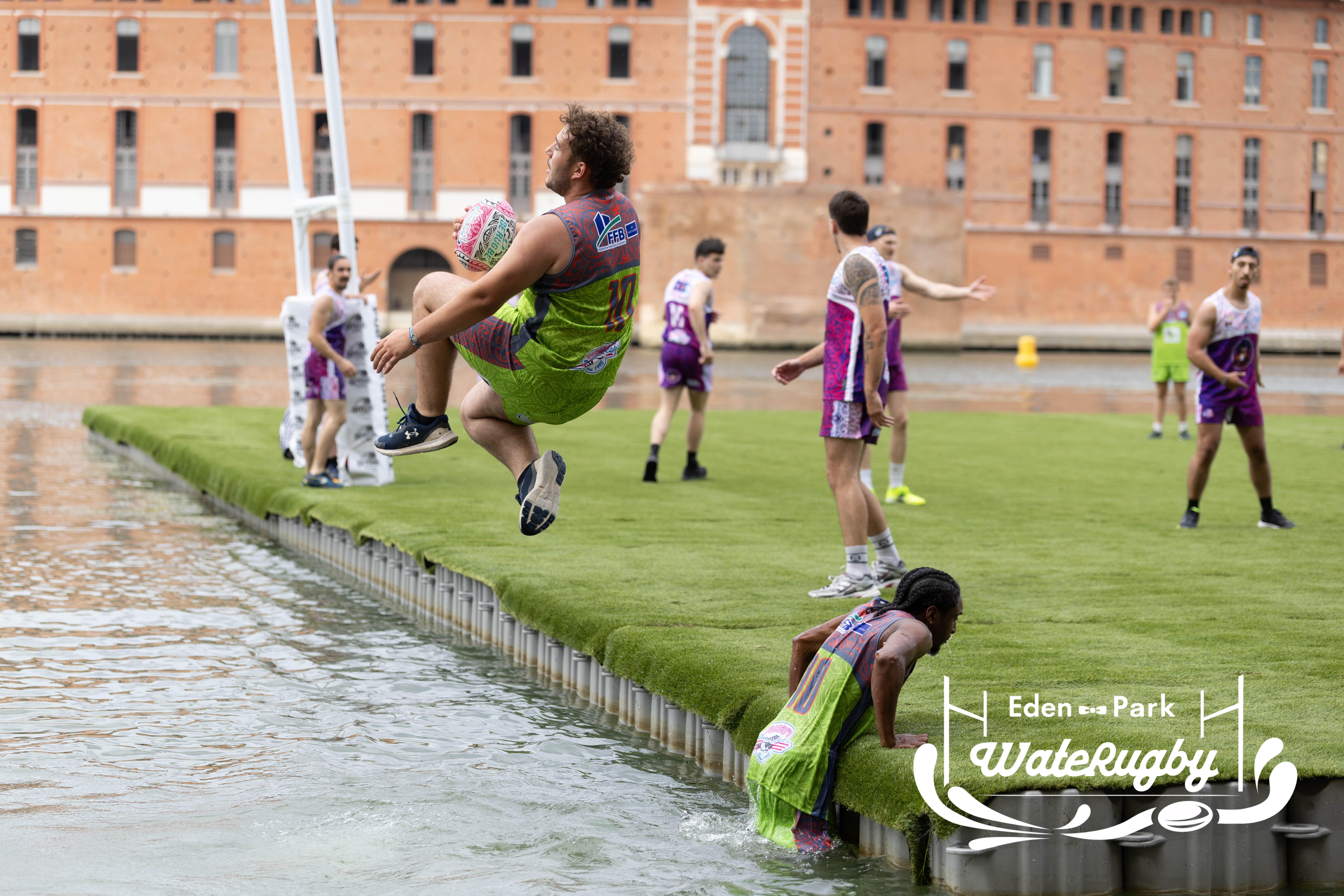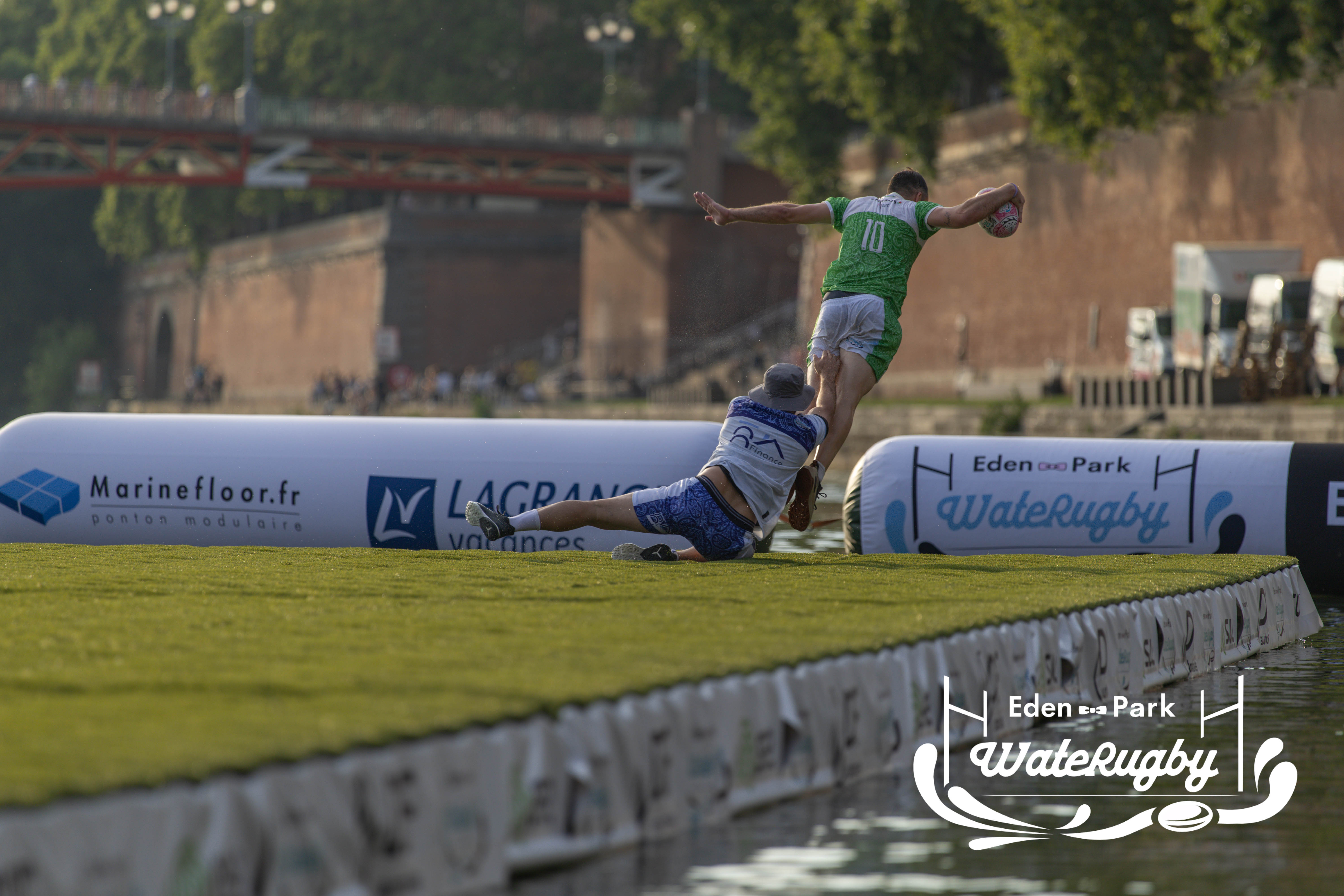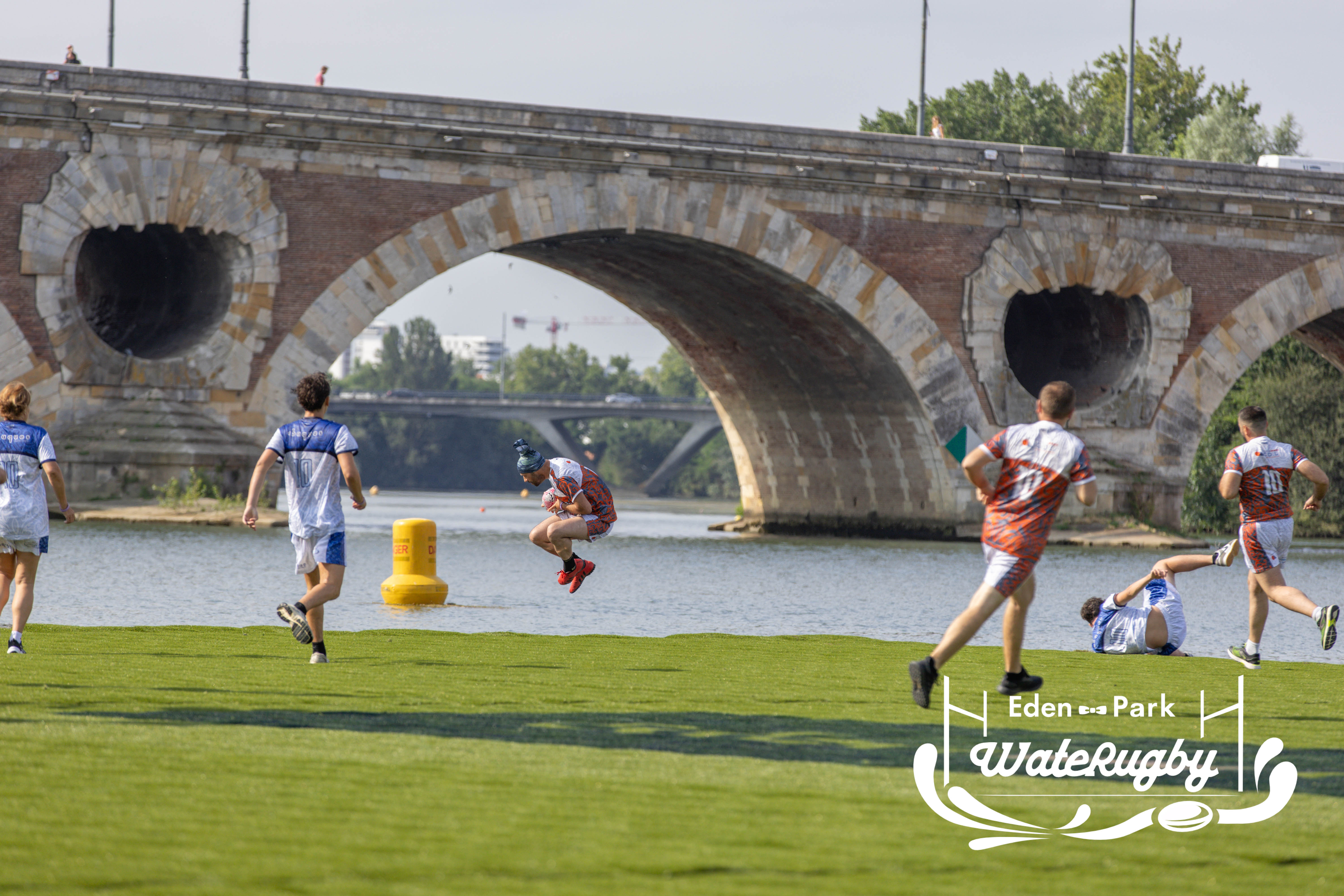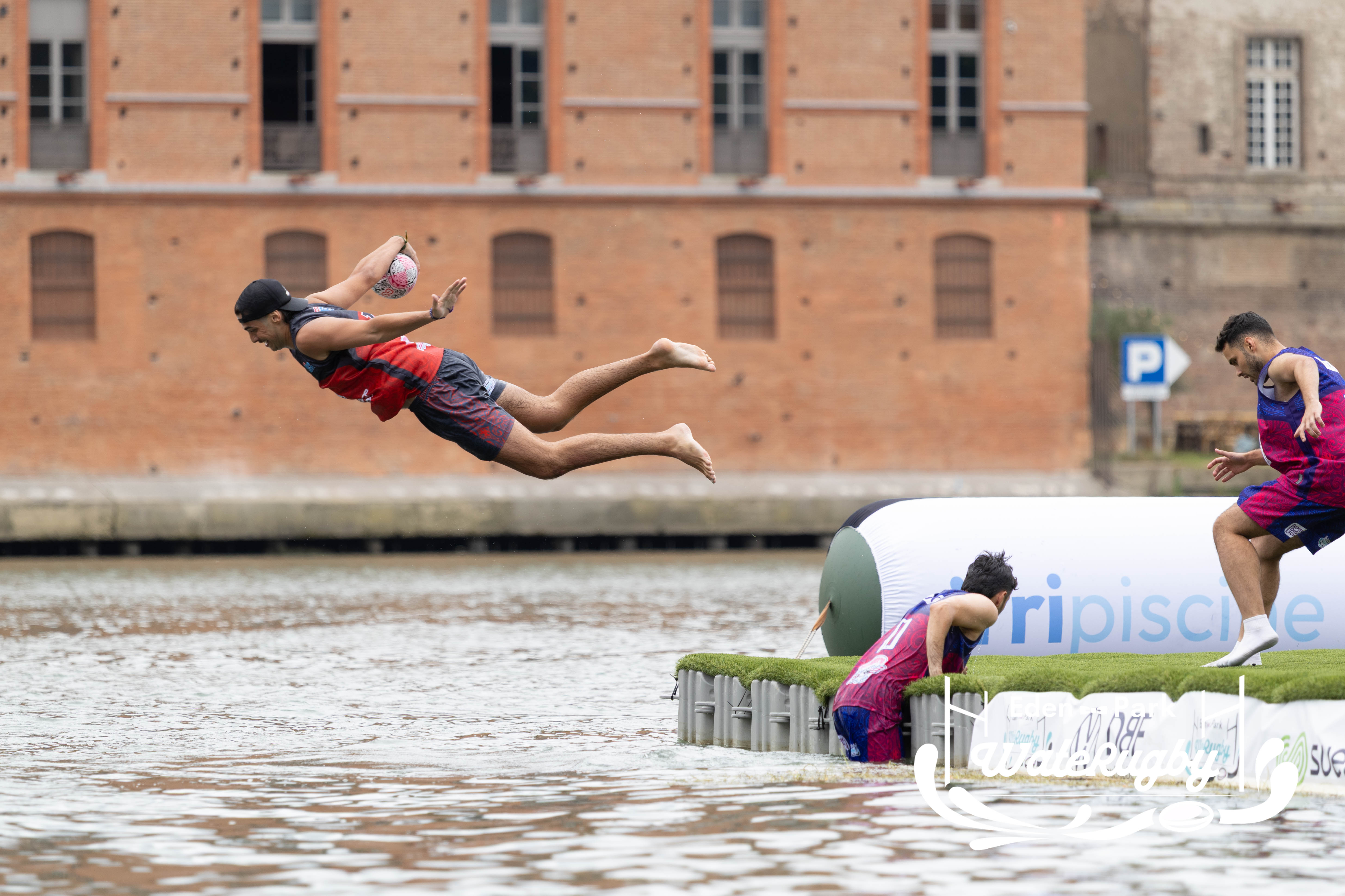 Compétition de rugby sur une barge sur la Garonne en plein centre de Toulouse