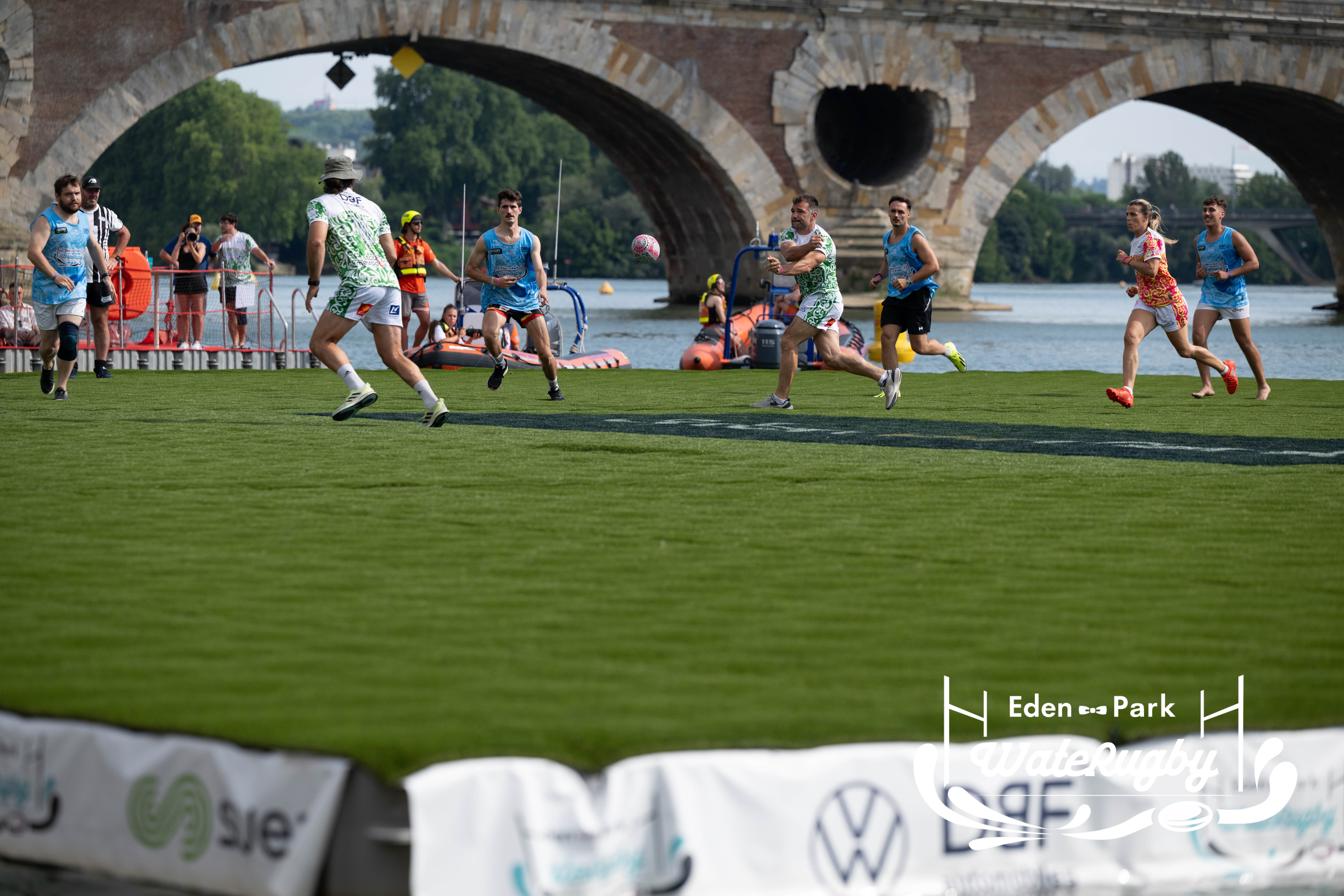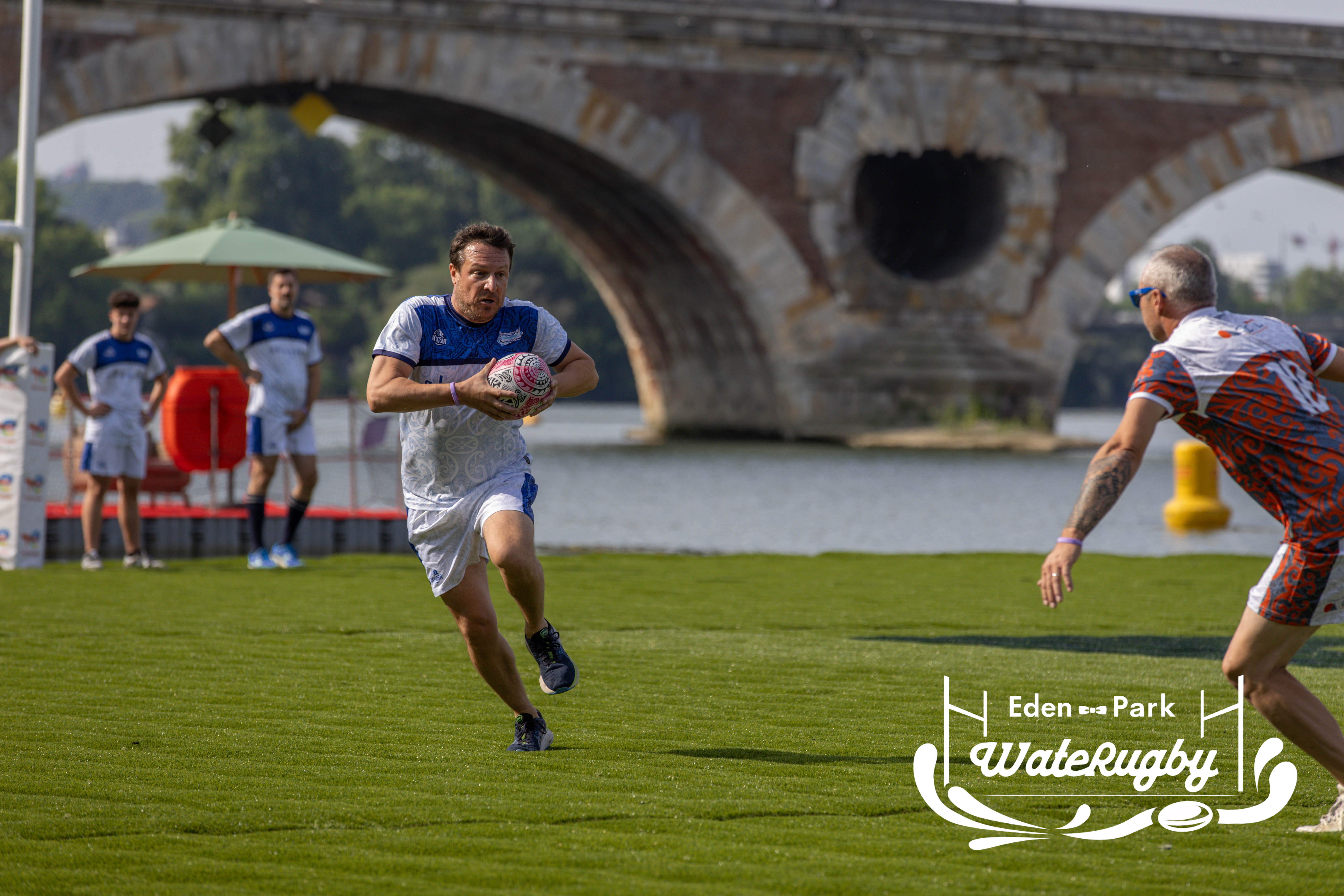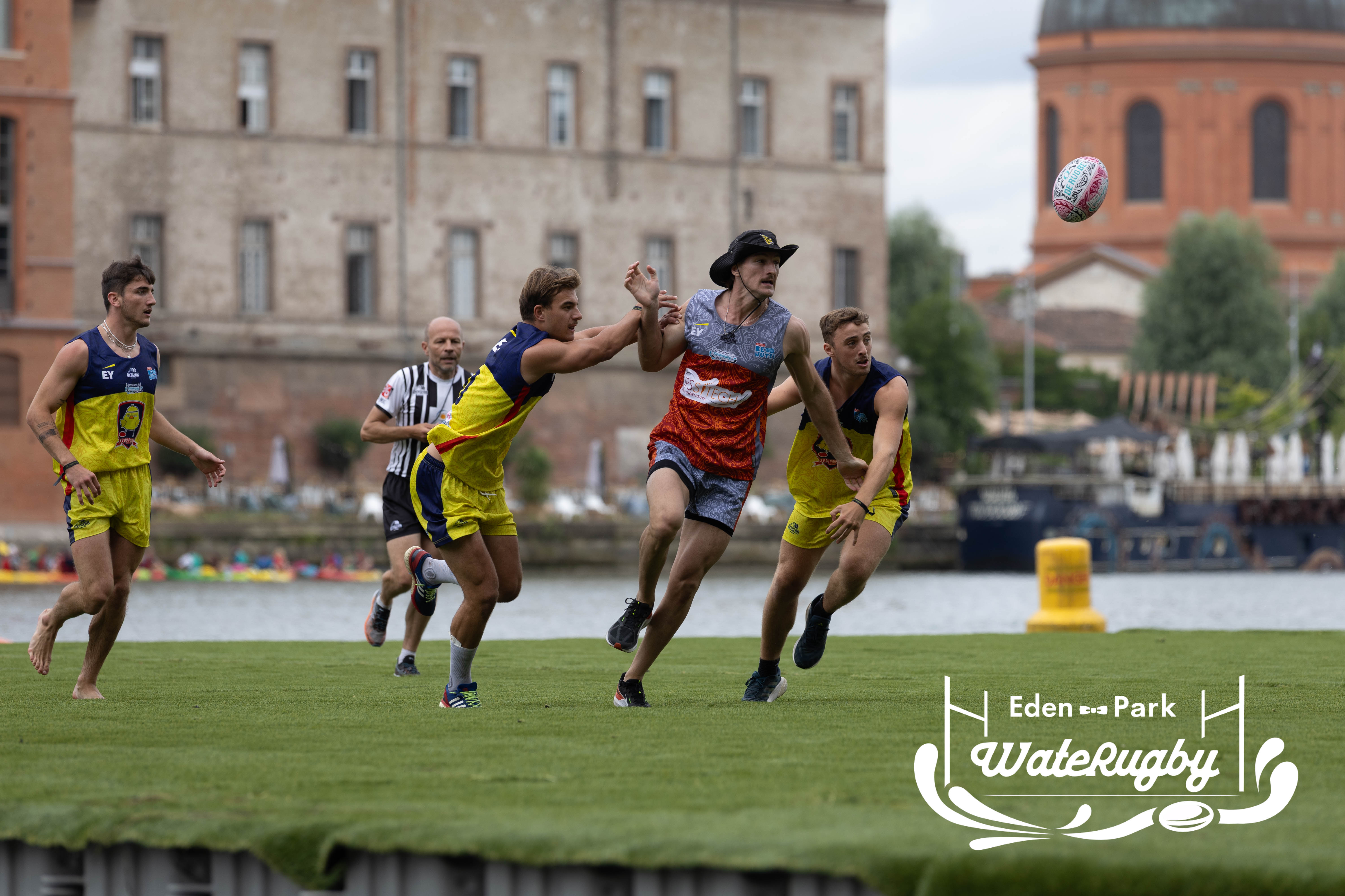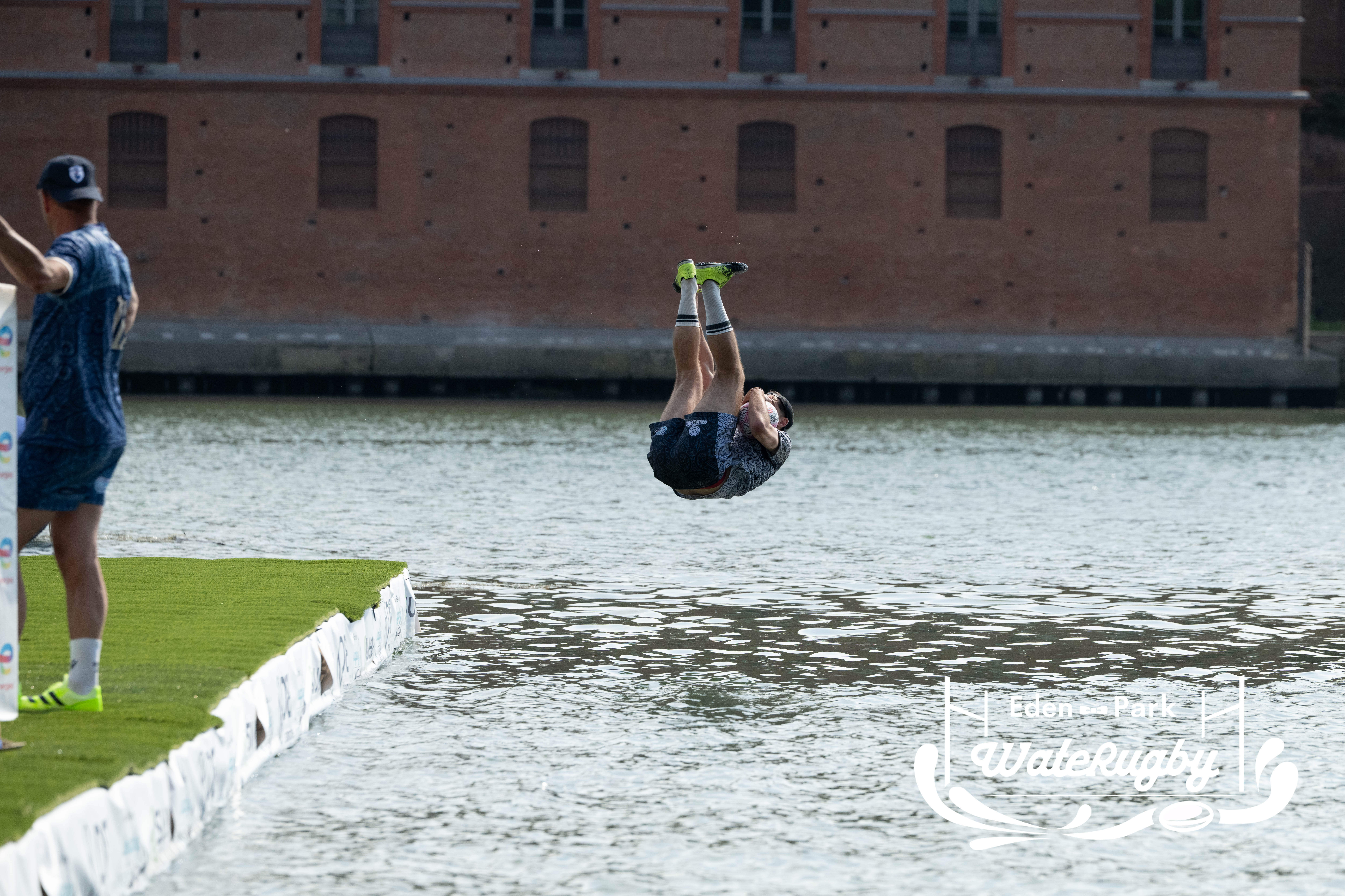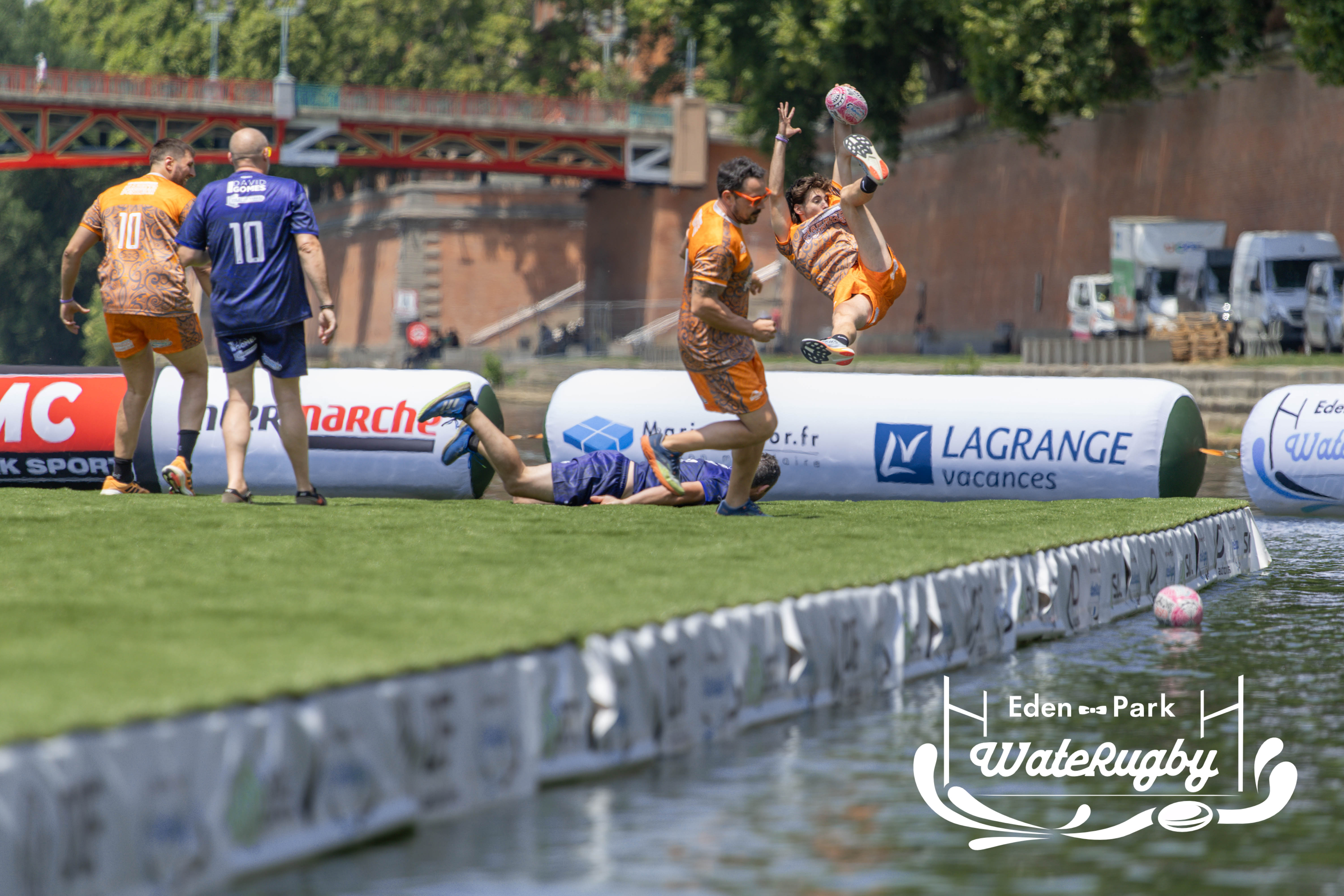 Compétition de rugby sur une barge sur la Garonne en plein centre de Toulouse