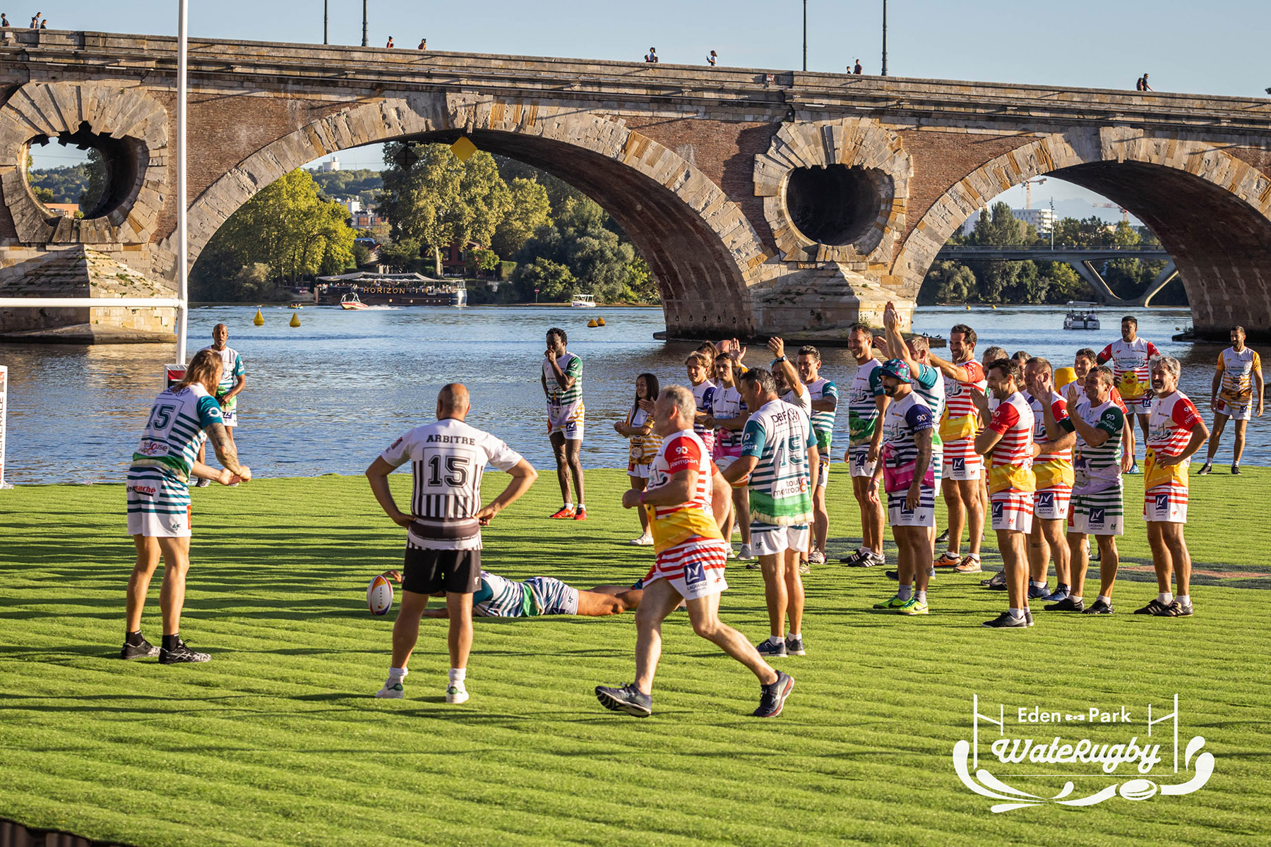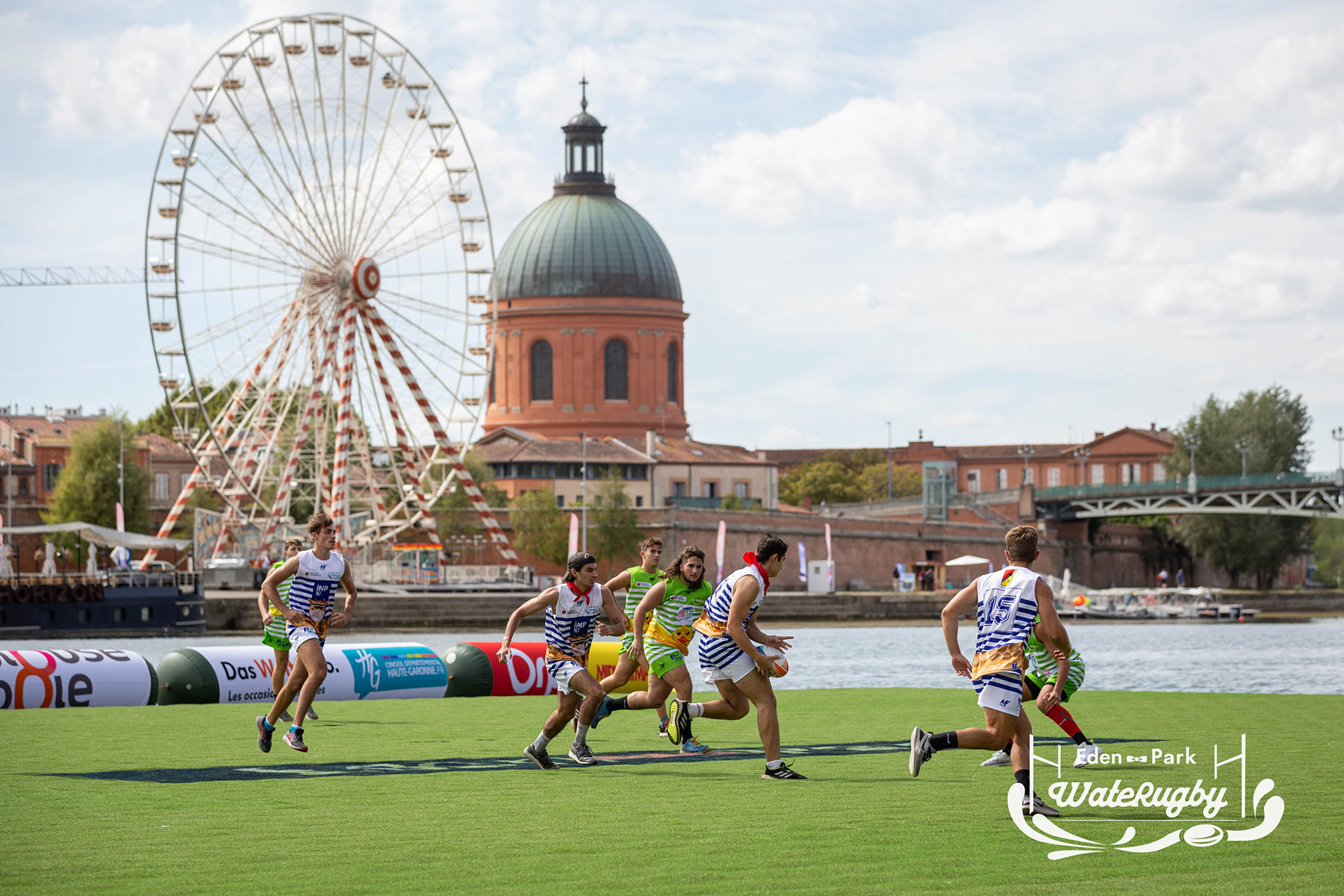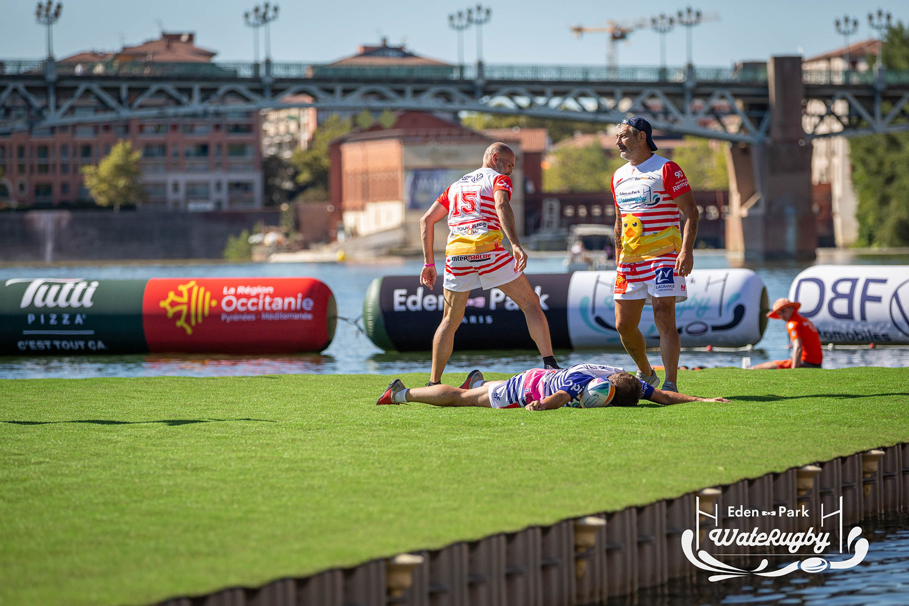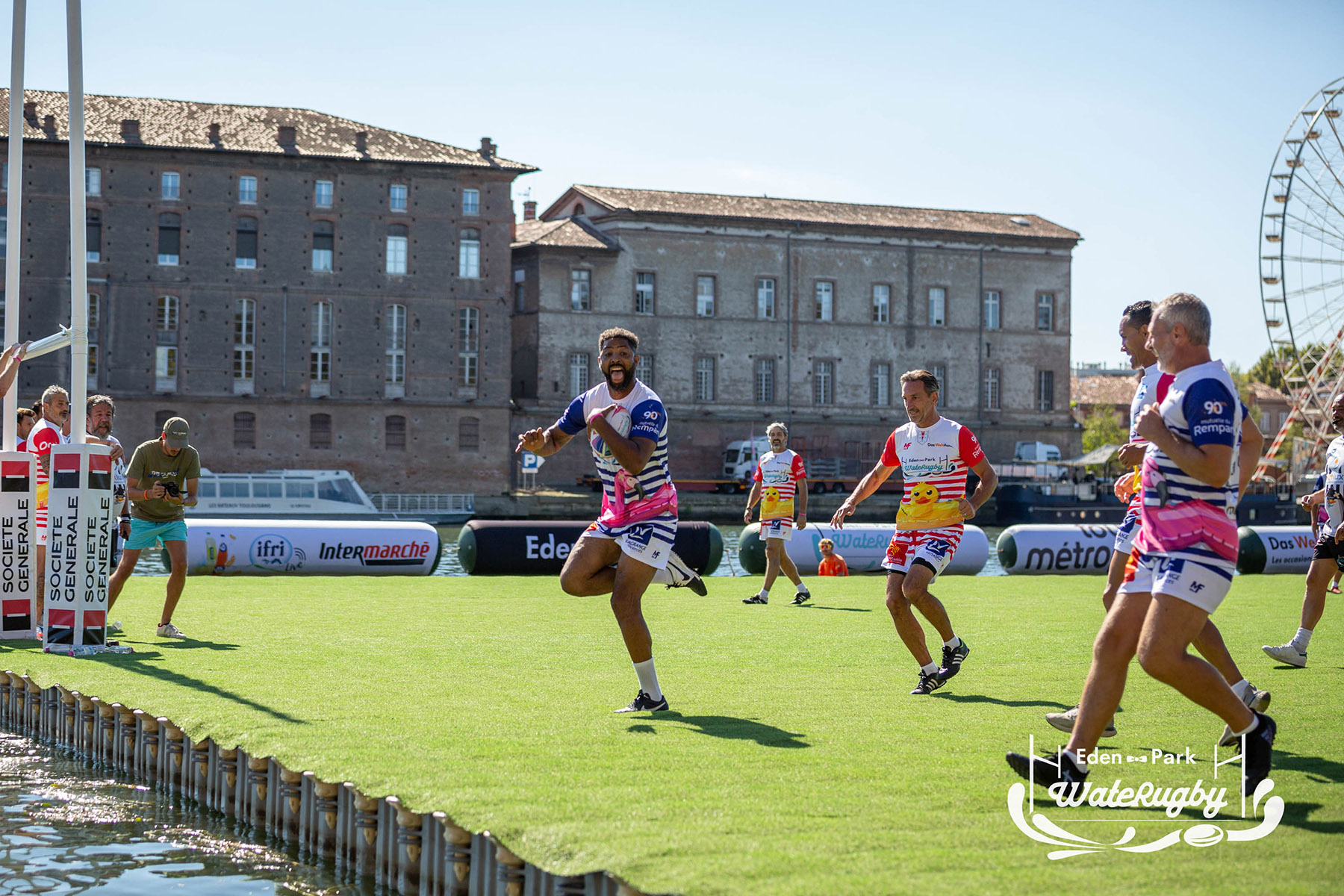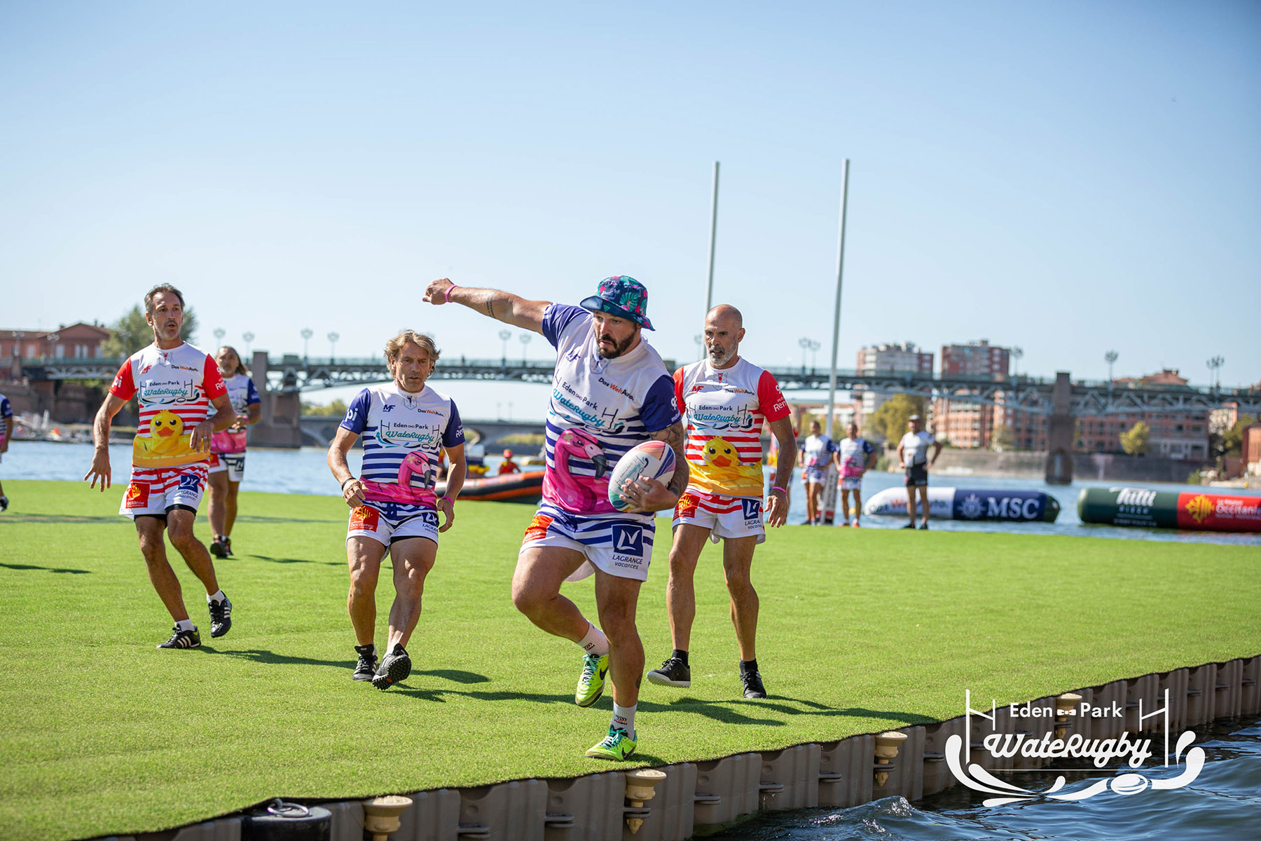 Compétition de rugby sur une barge sur la Garonne en plein centre de Toulouse