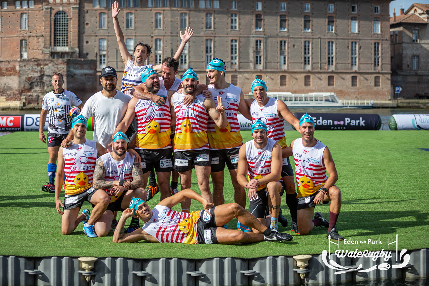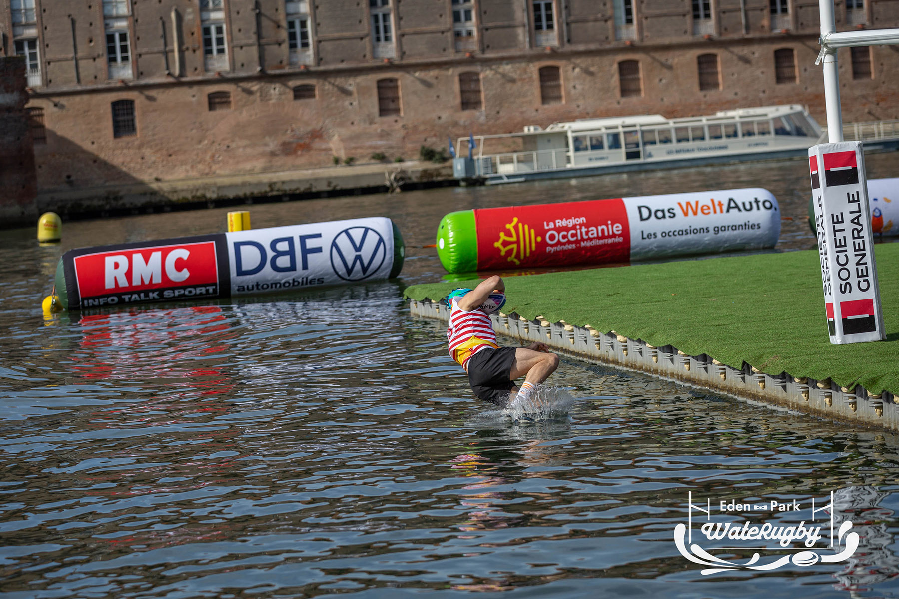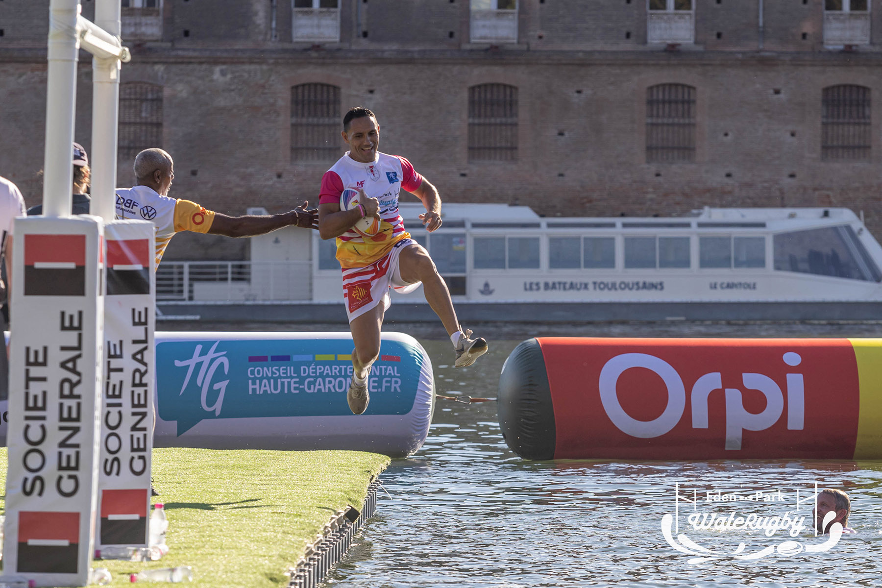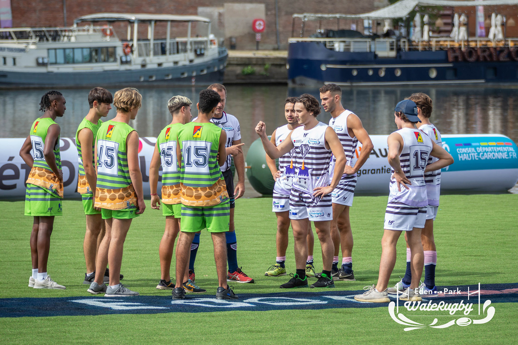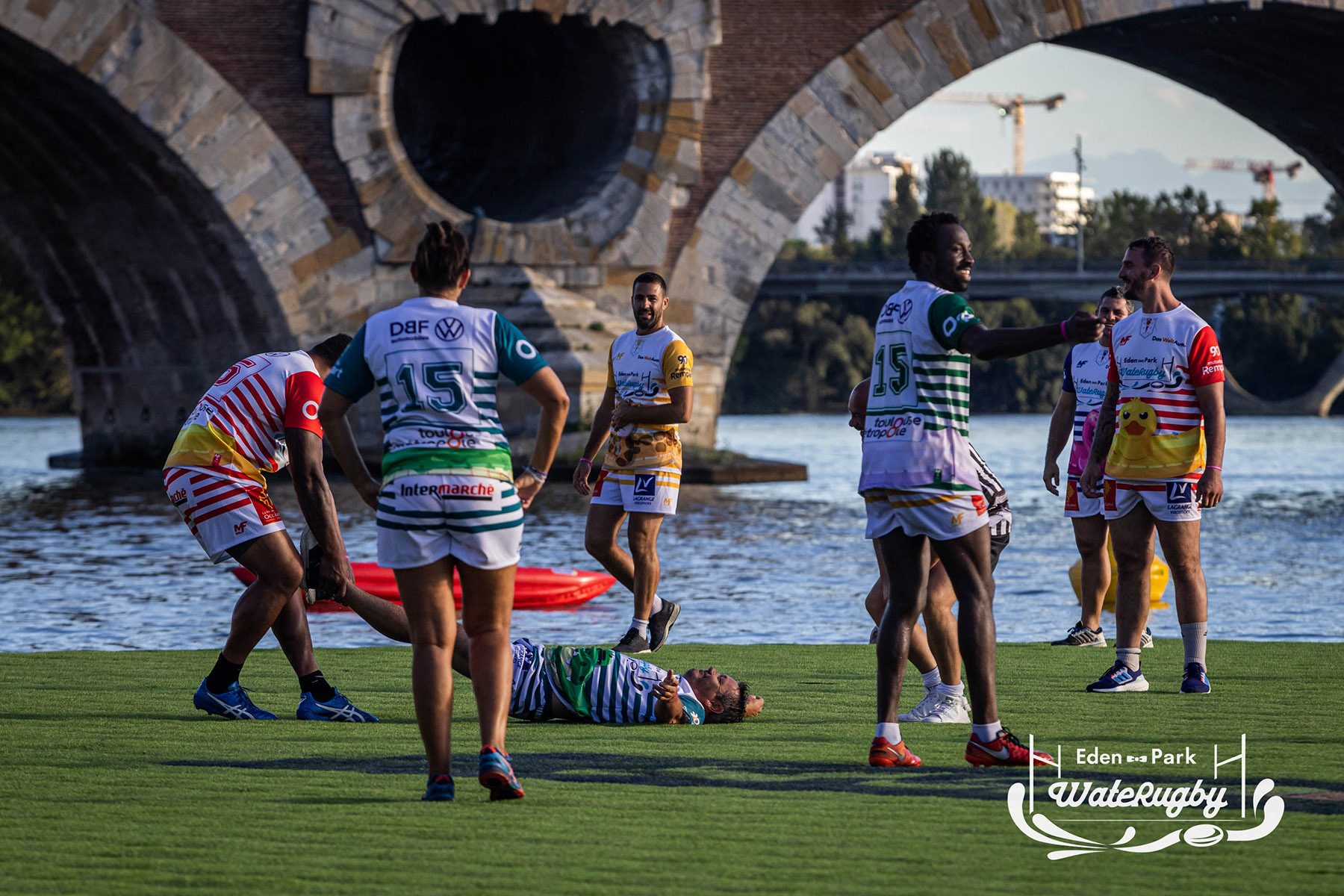 Compétition de rugby sur une barge sur la Garonne en plein centre de Toulouse