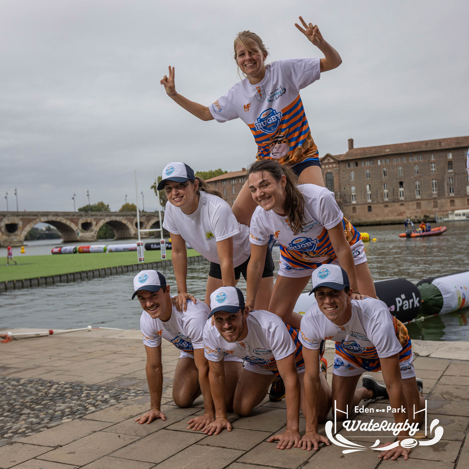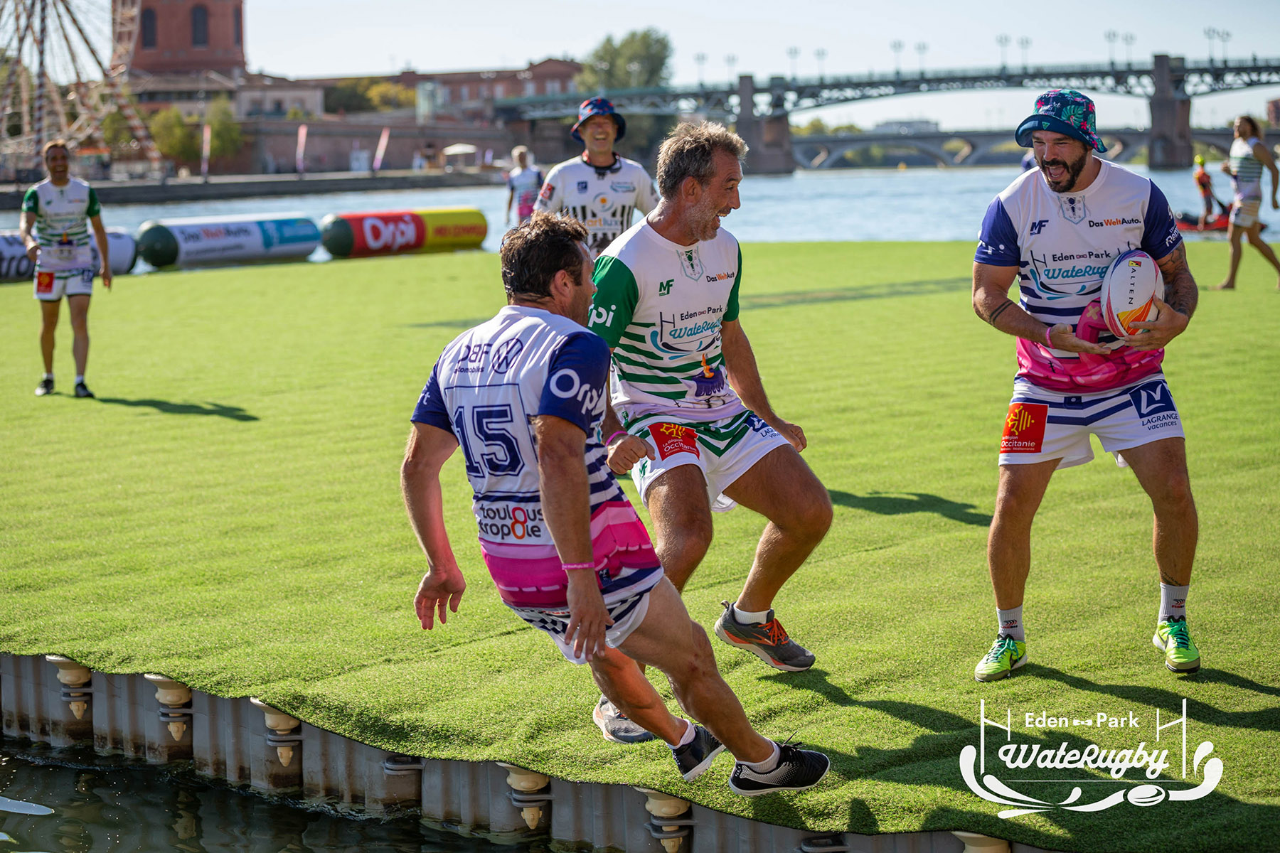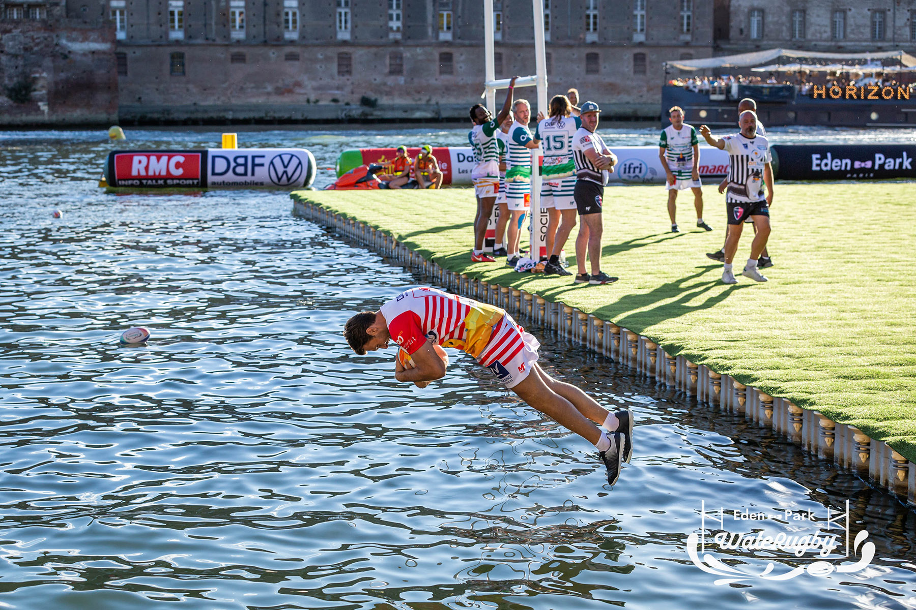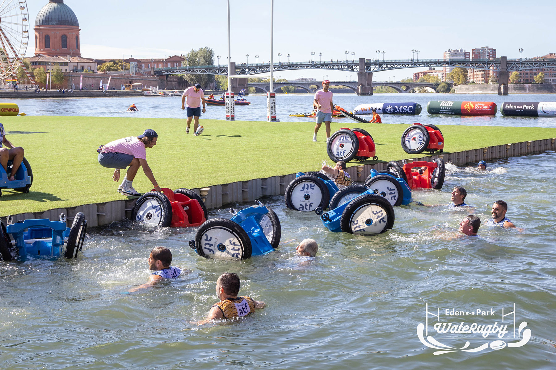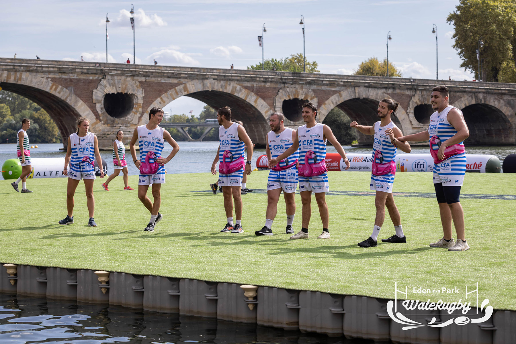 Compétition de rugby sur une barge sur la Garonne en plein centre de Toulouse