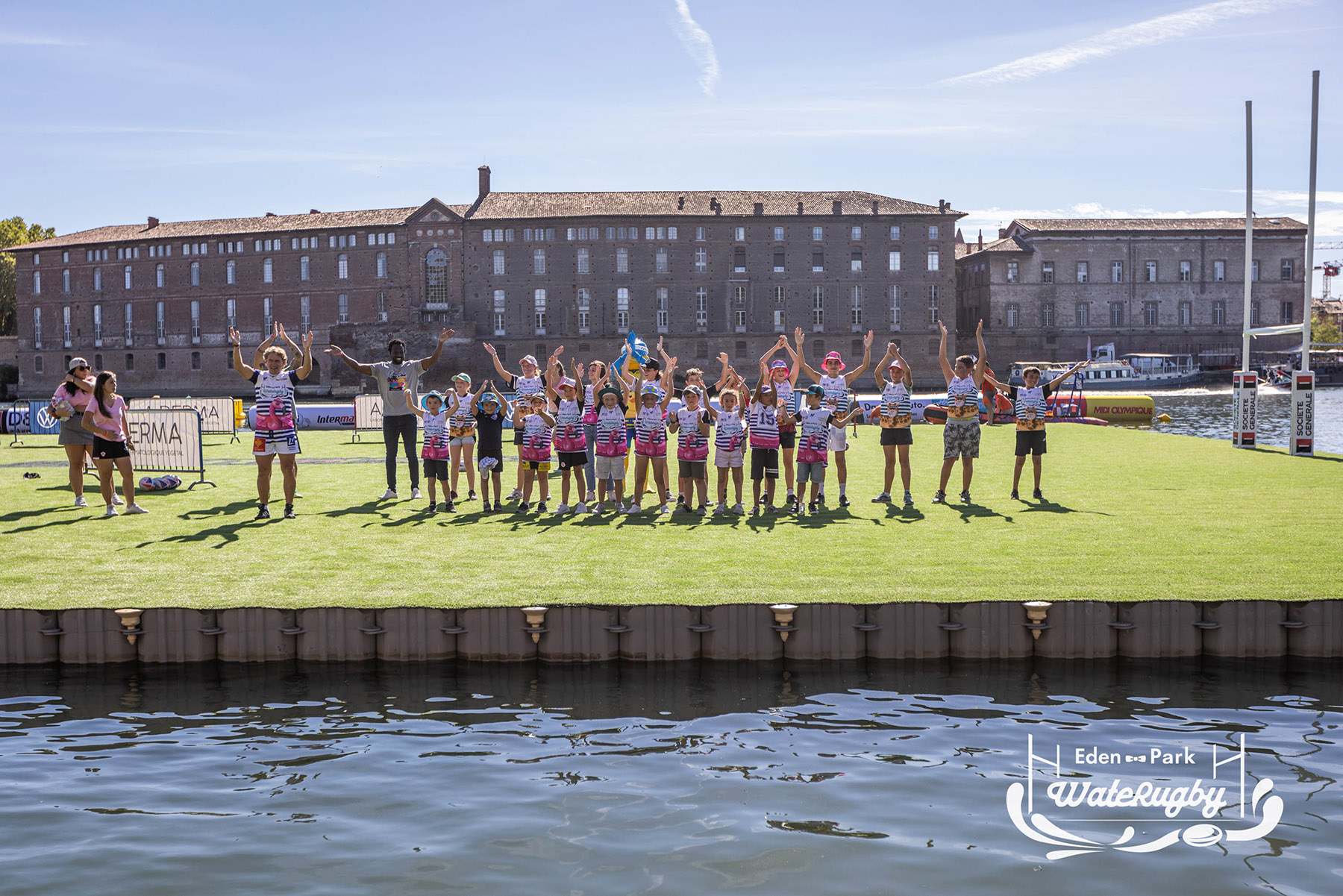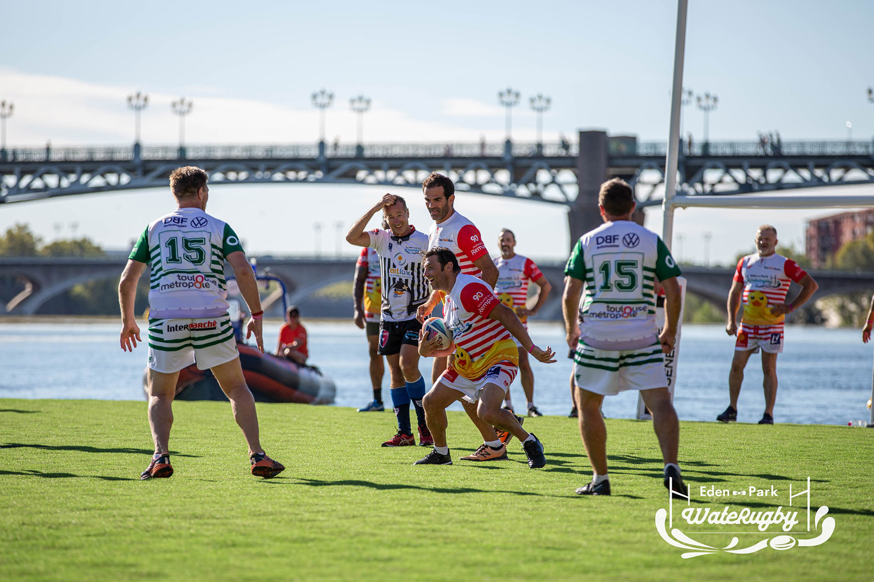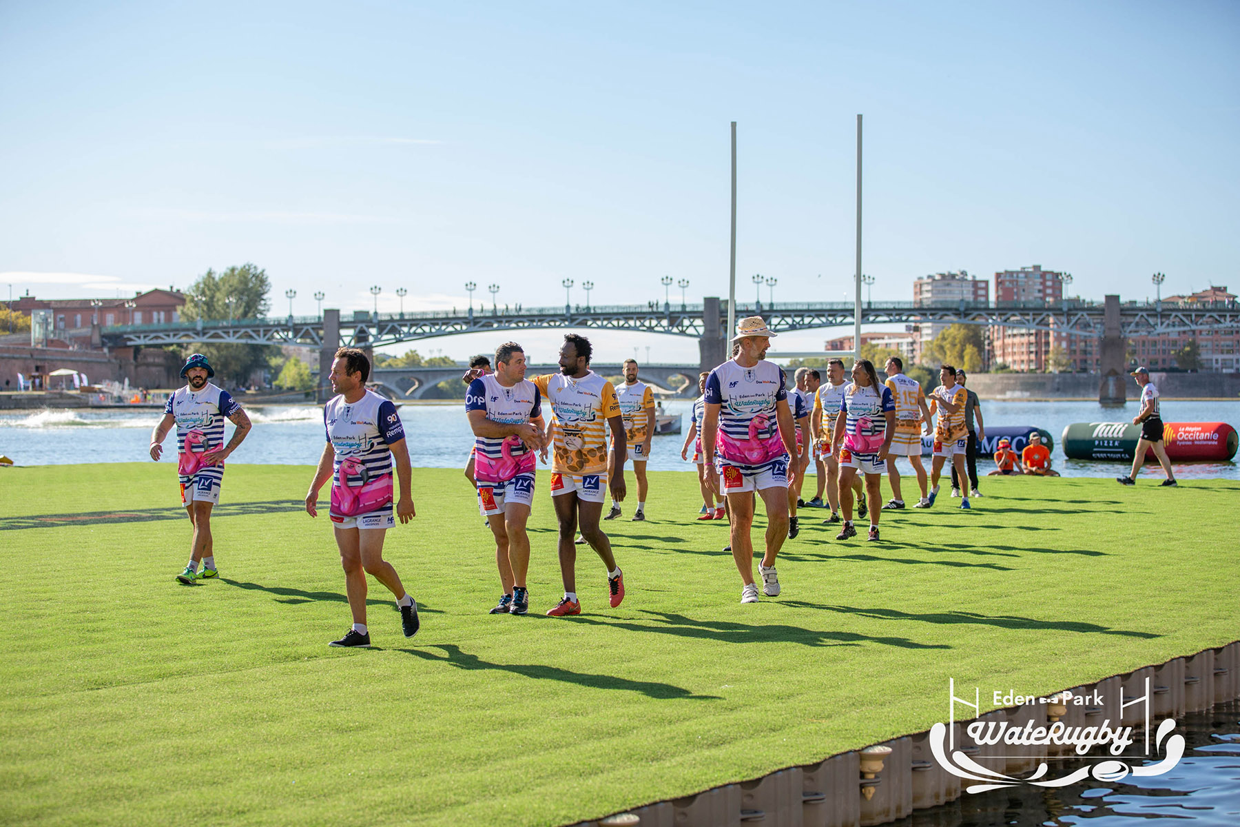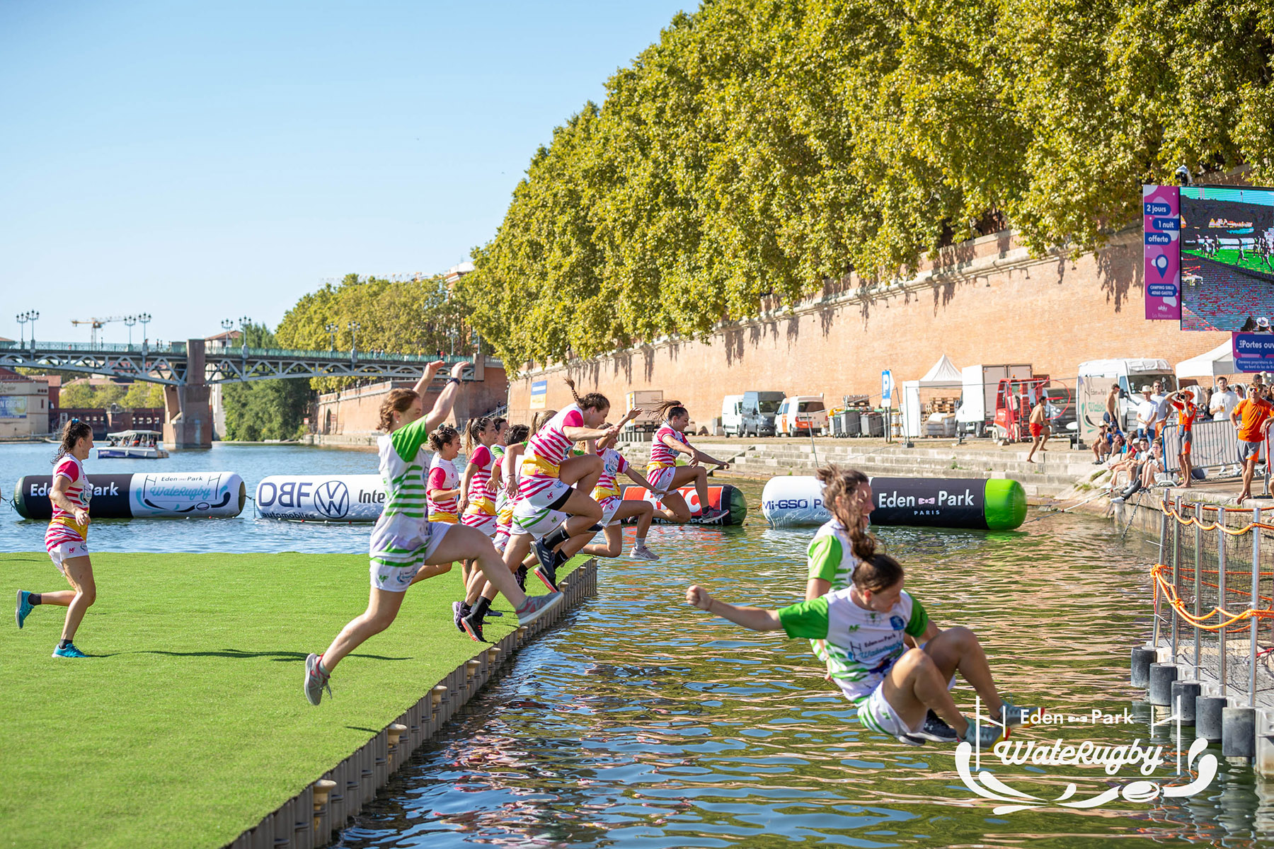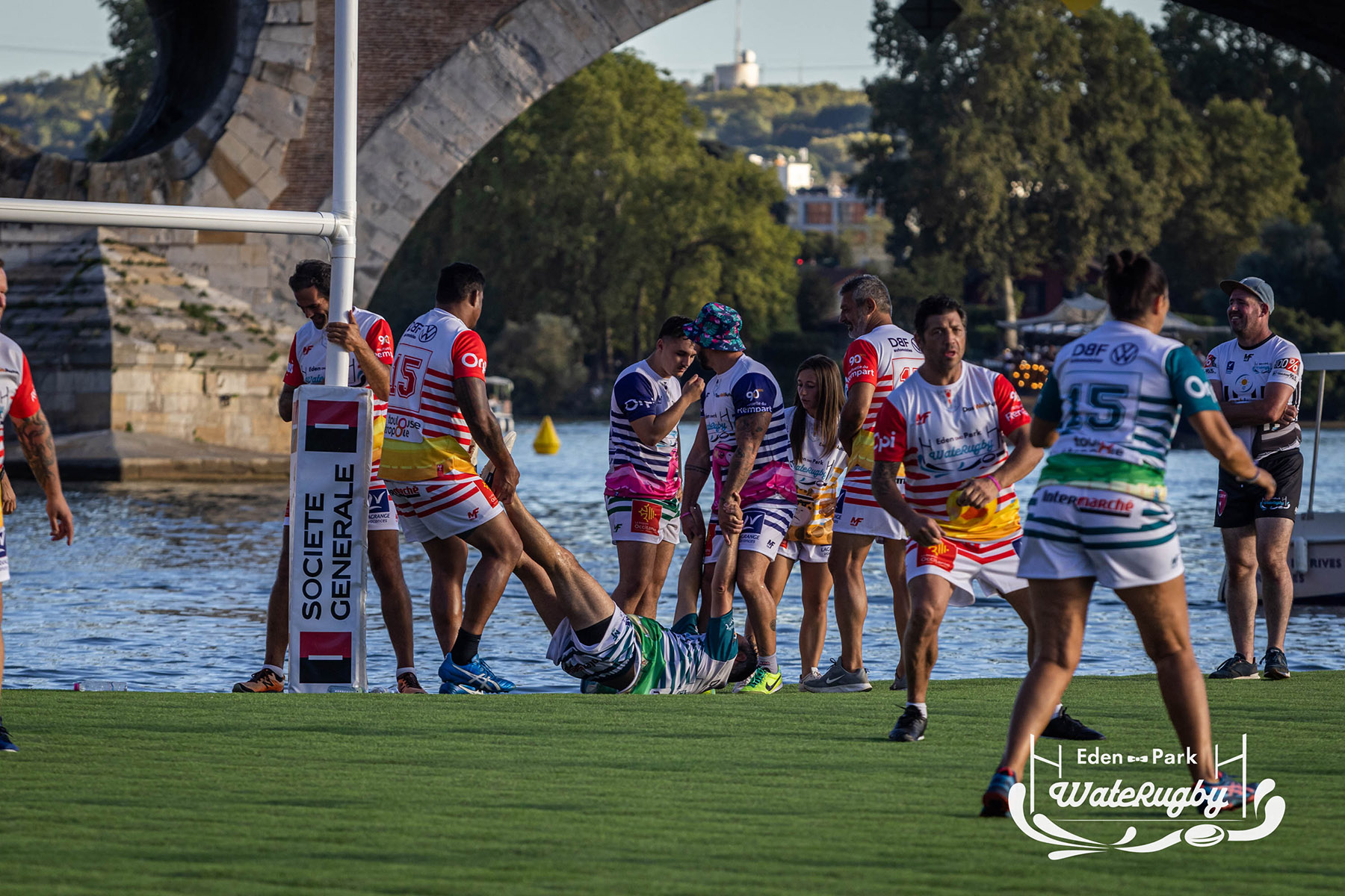Compétition de rugby sur une barge sur la Garonne en plein centre de Toulouse