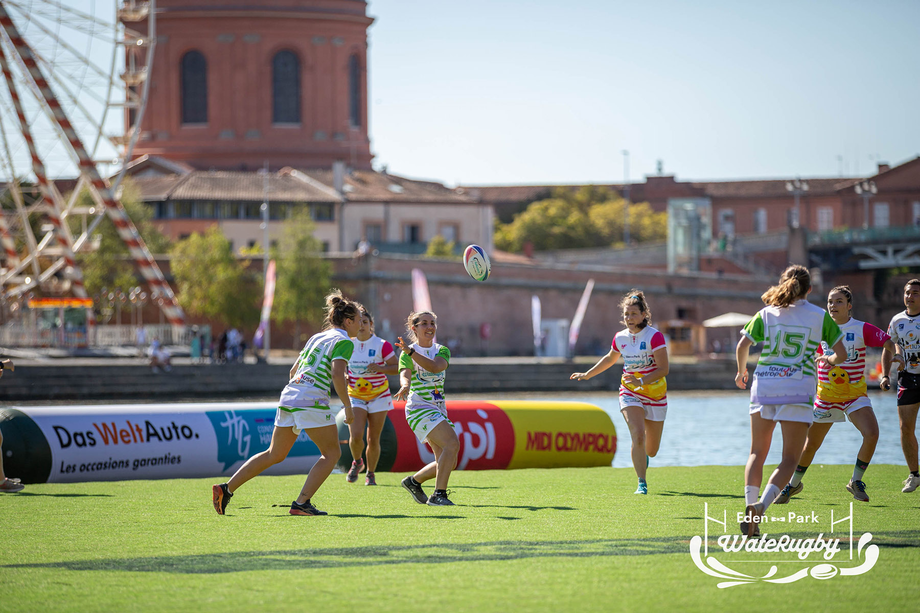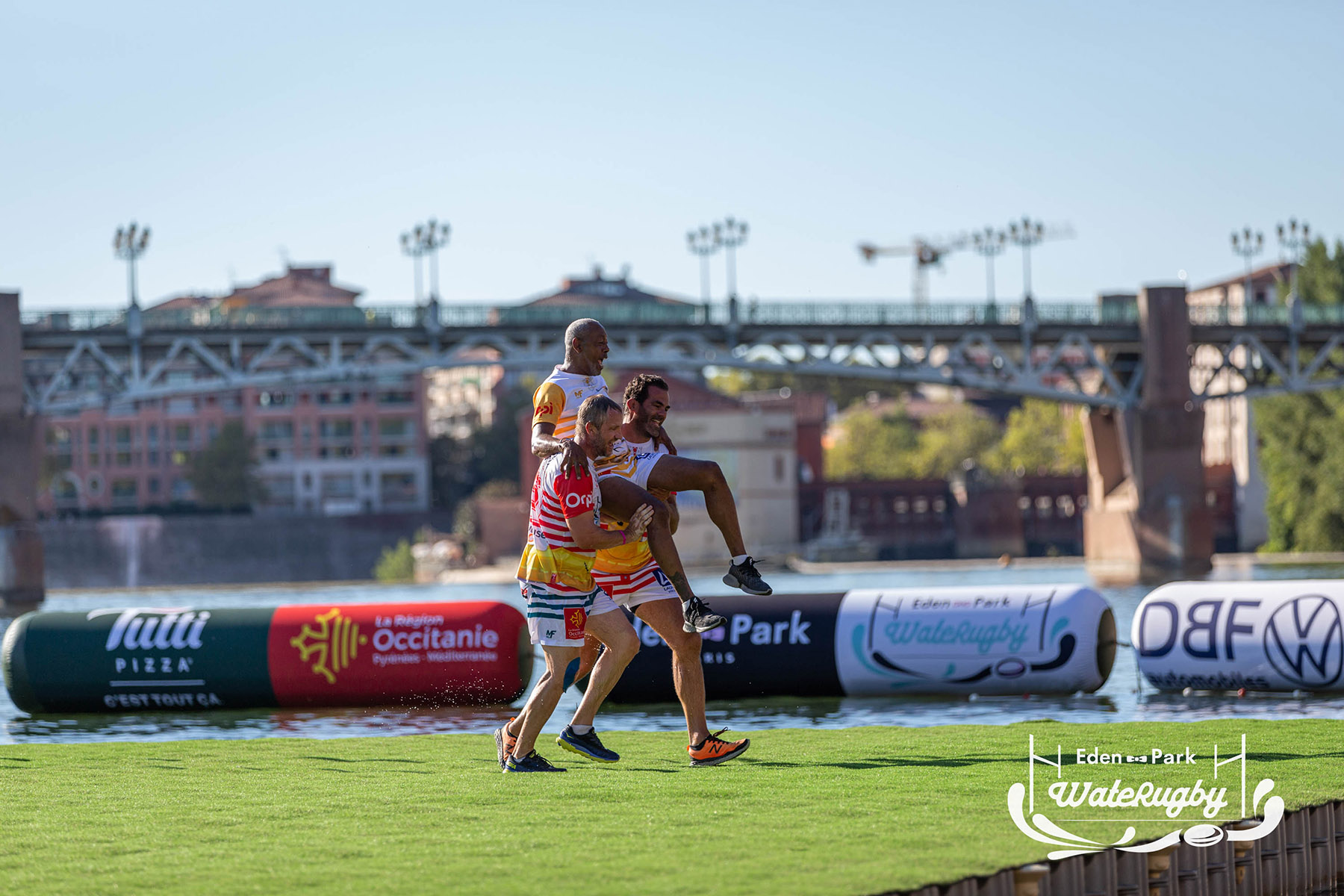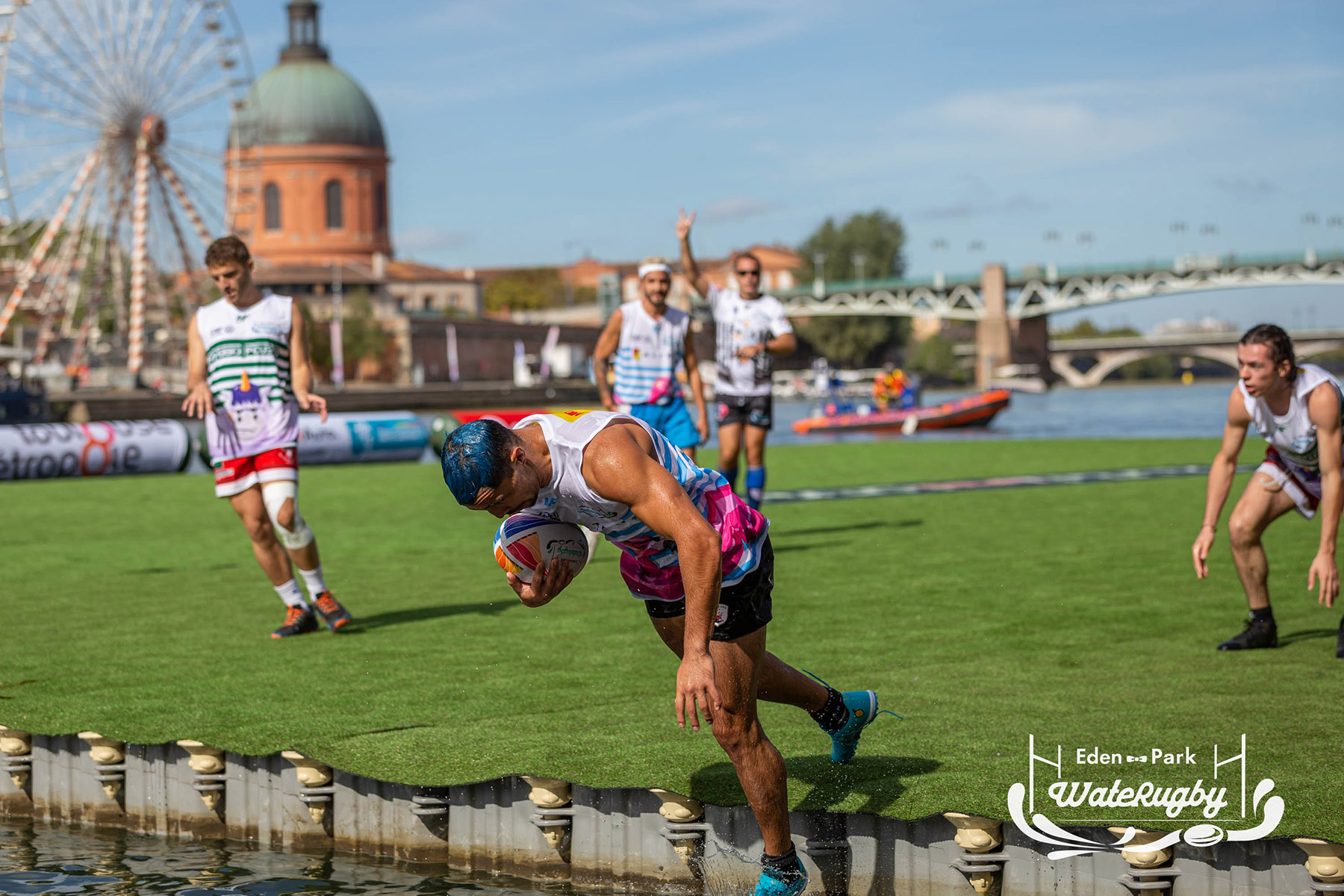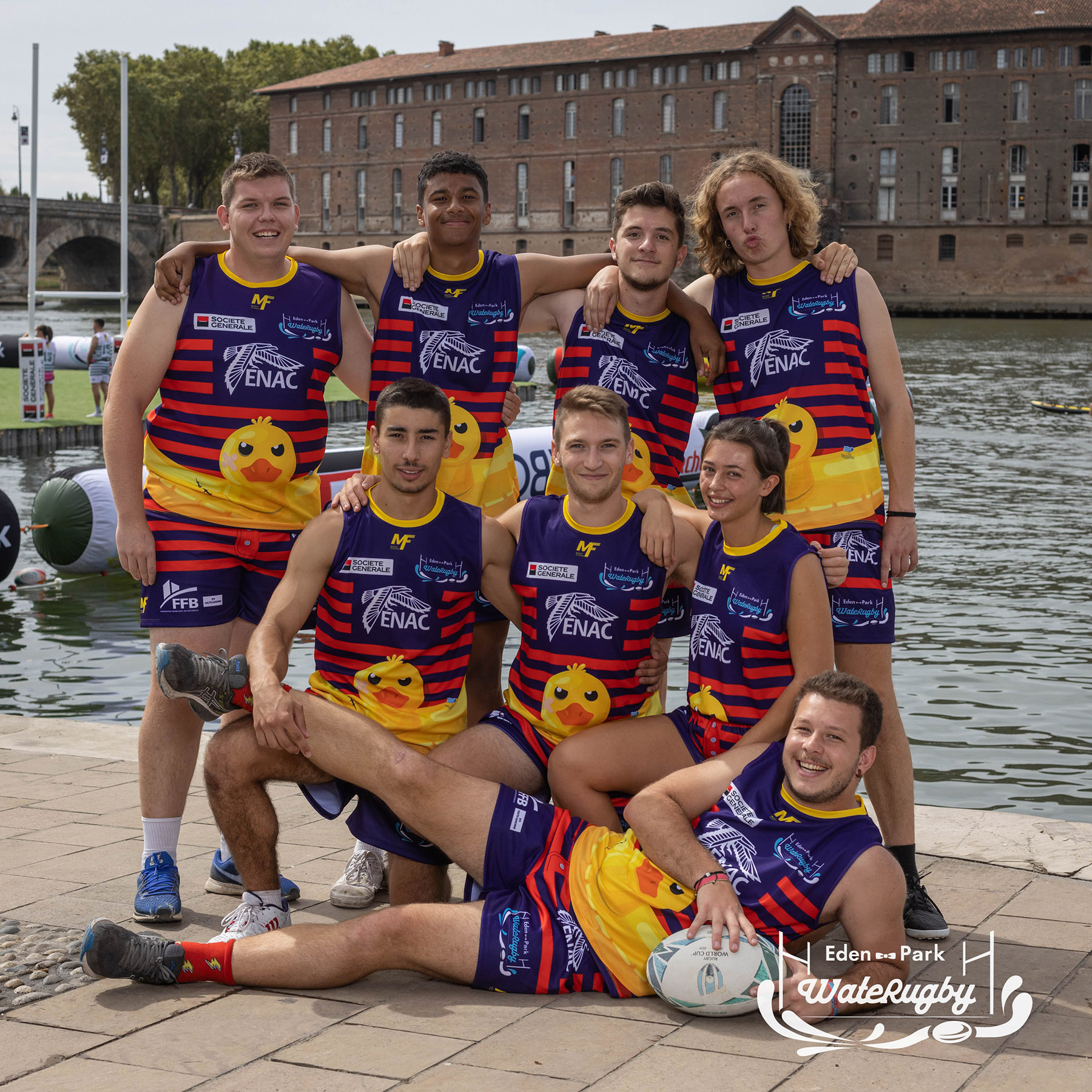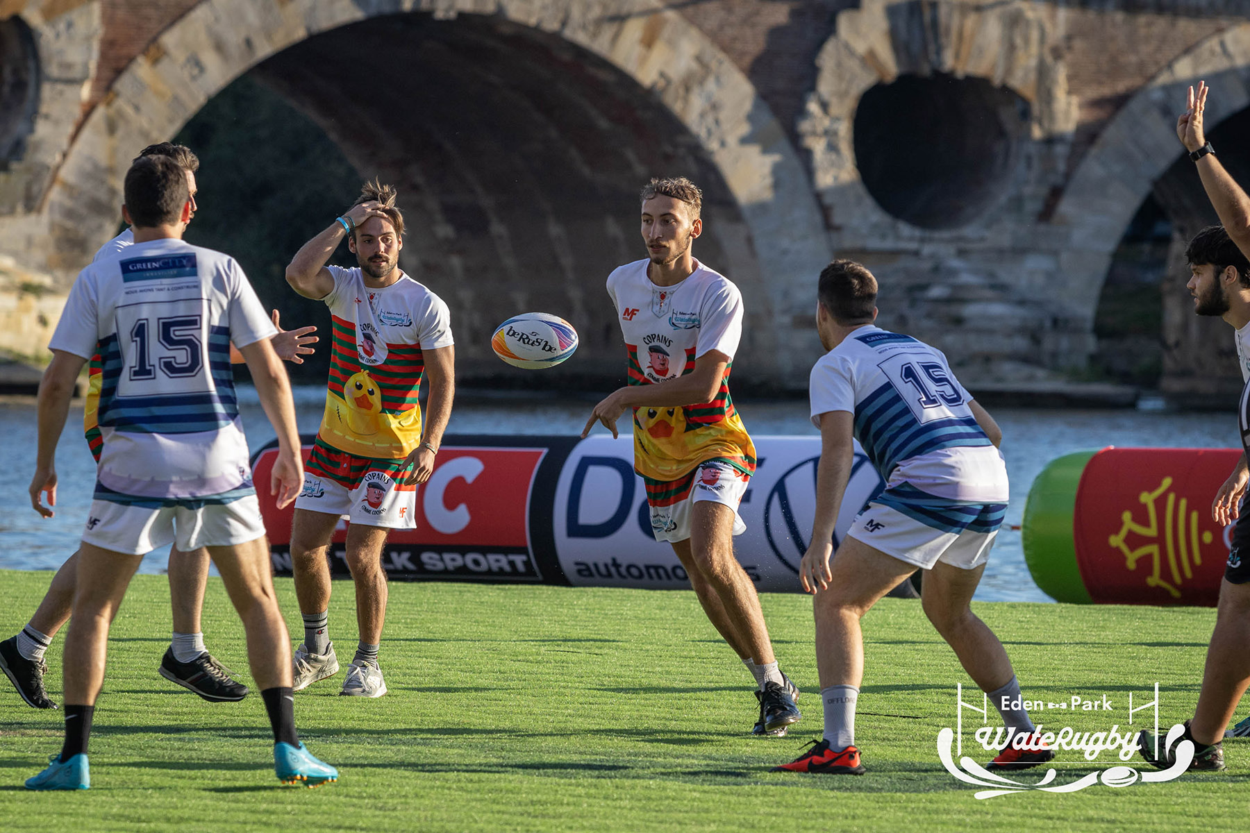 Compétition de rugby sur une barge sur la Garonne en plein centre de Toulouse