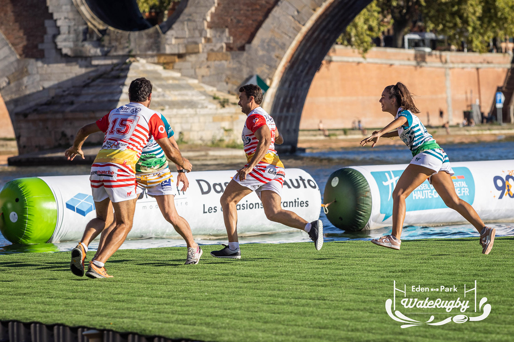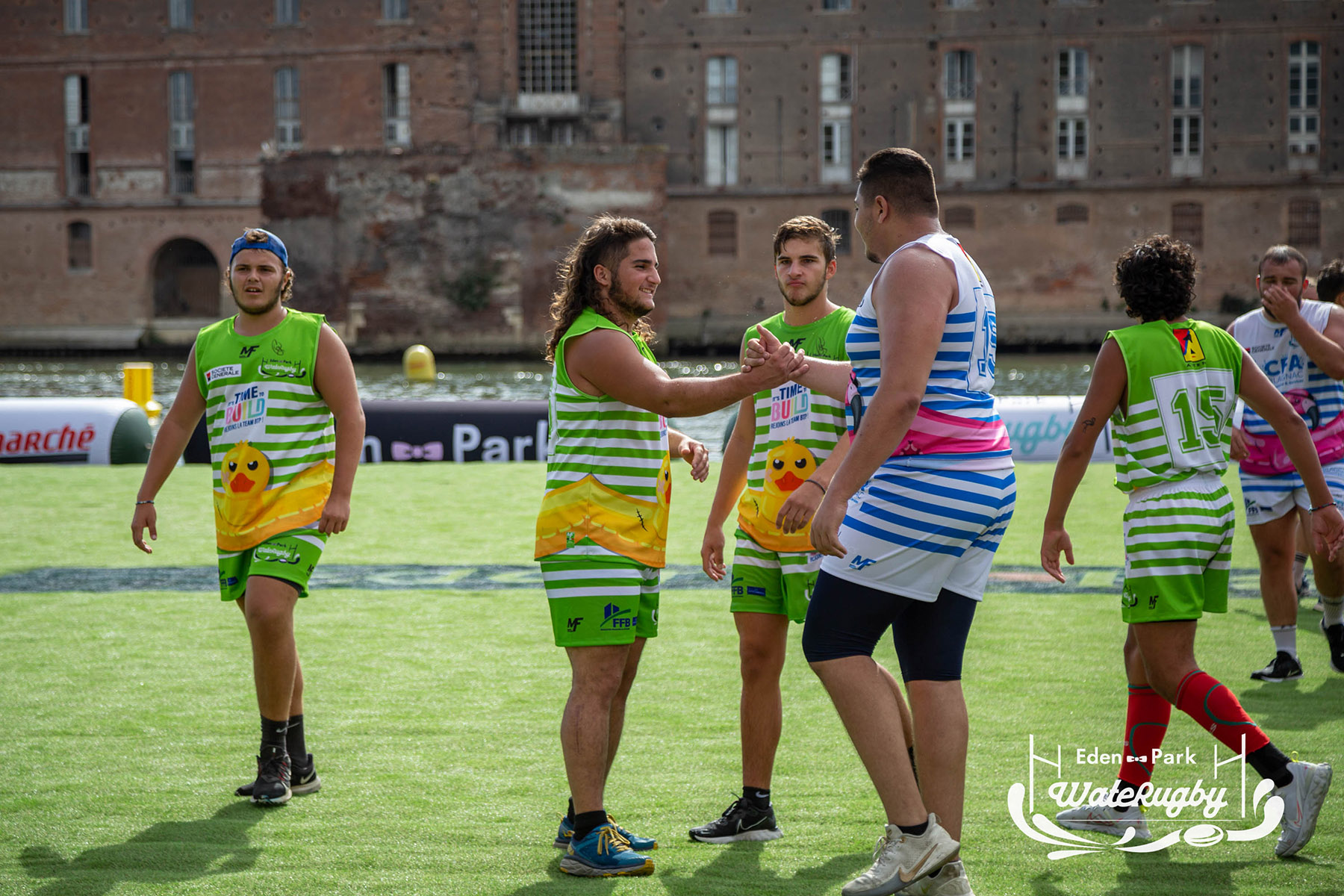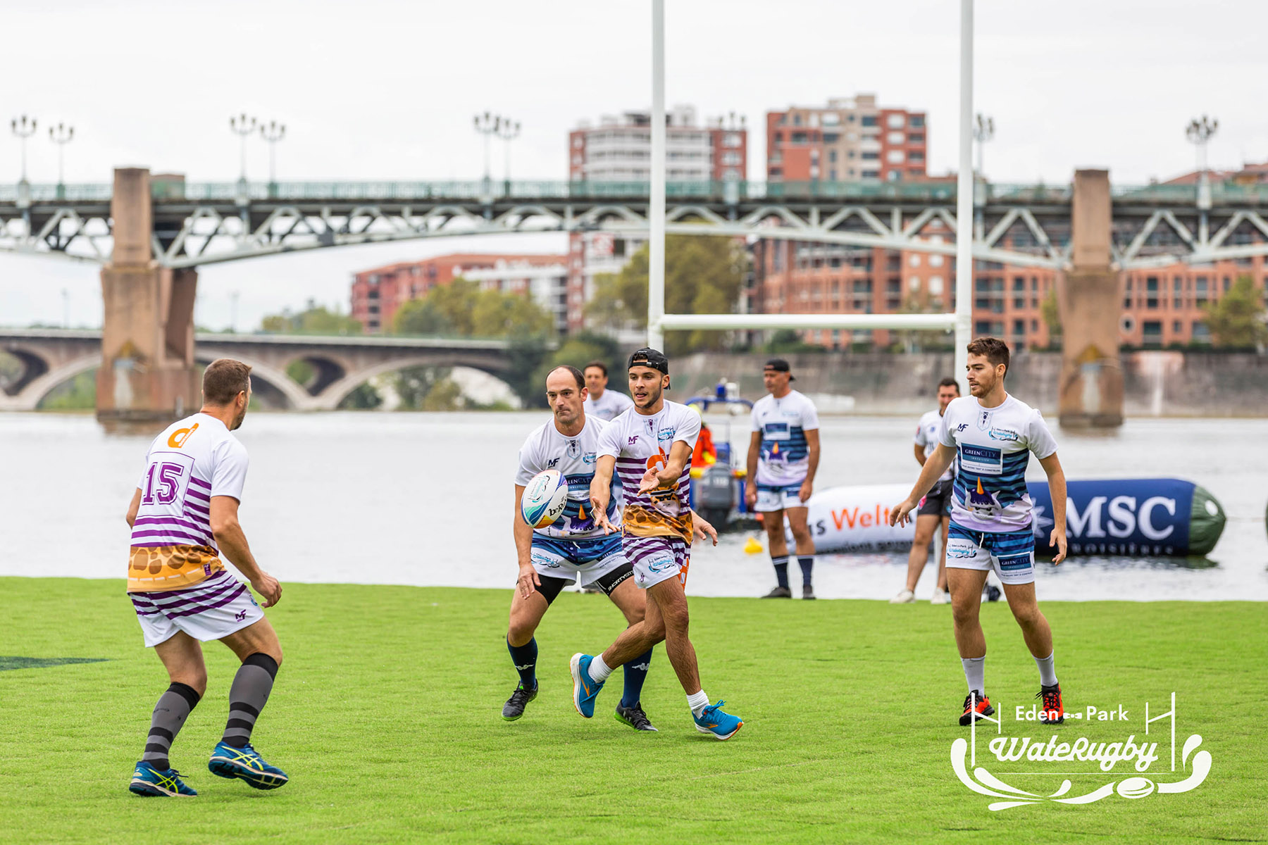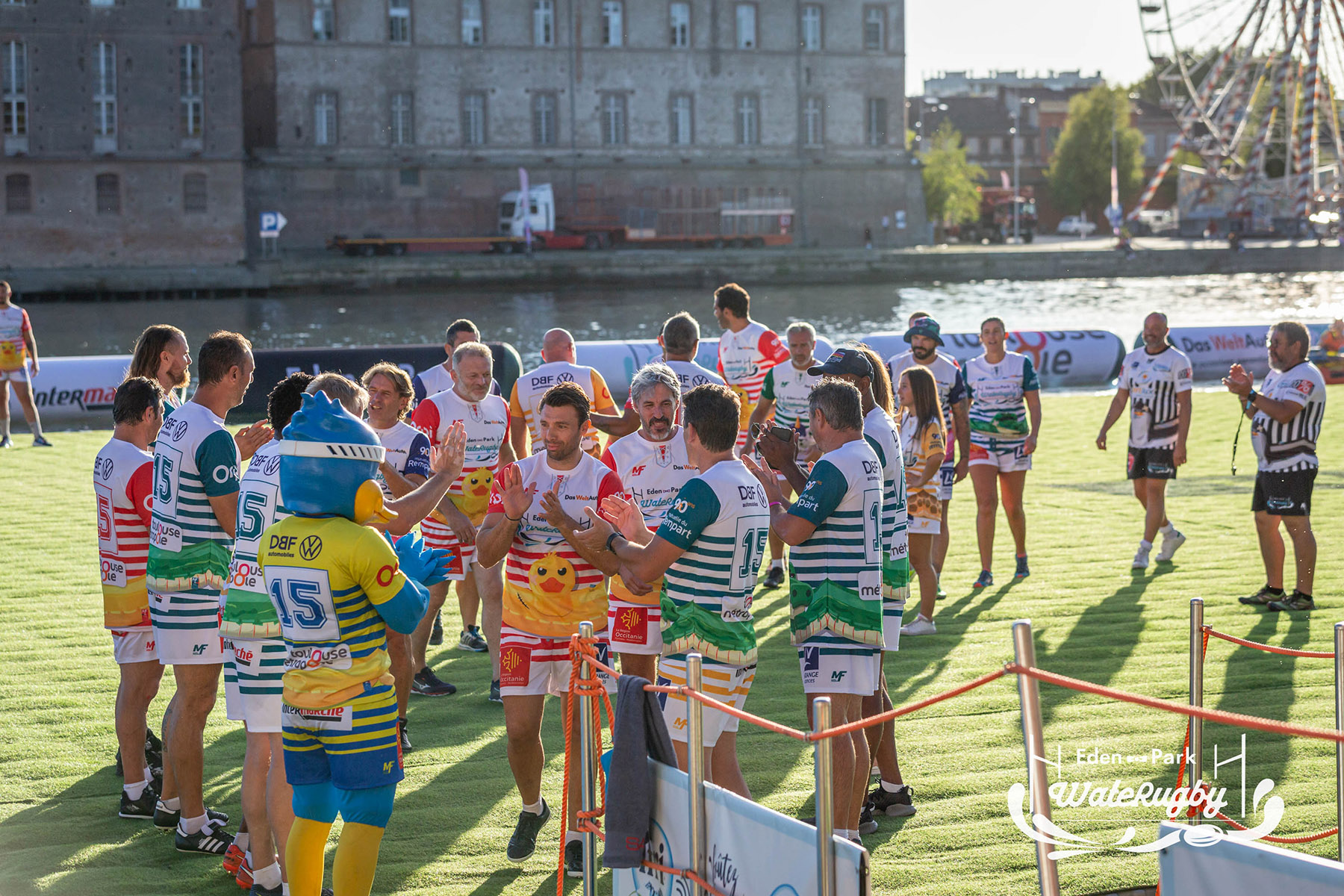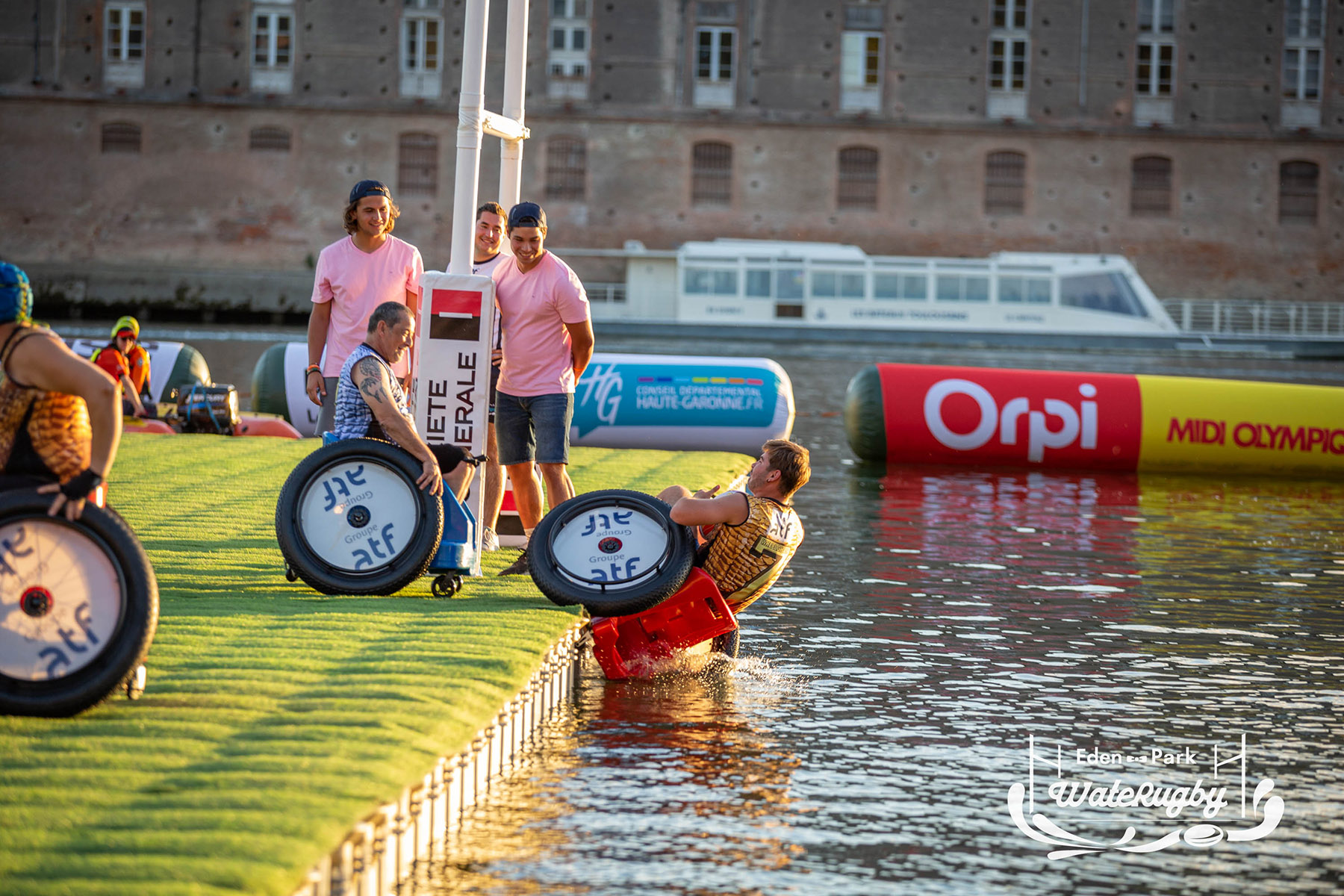 Compétition de rugby sur une barge sur la Garonne en plein centre de Toulouse