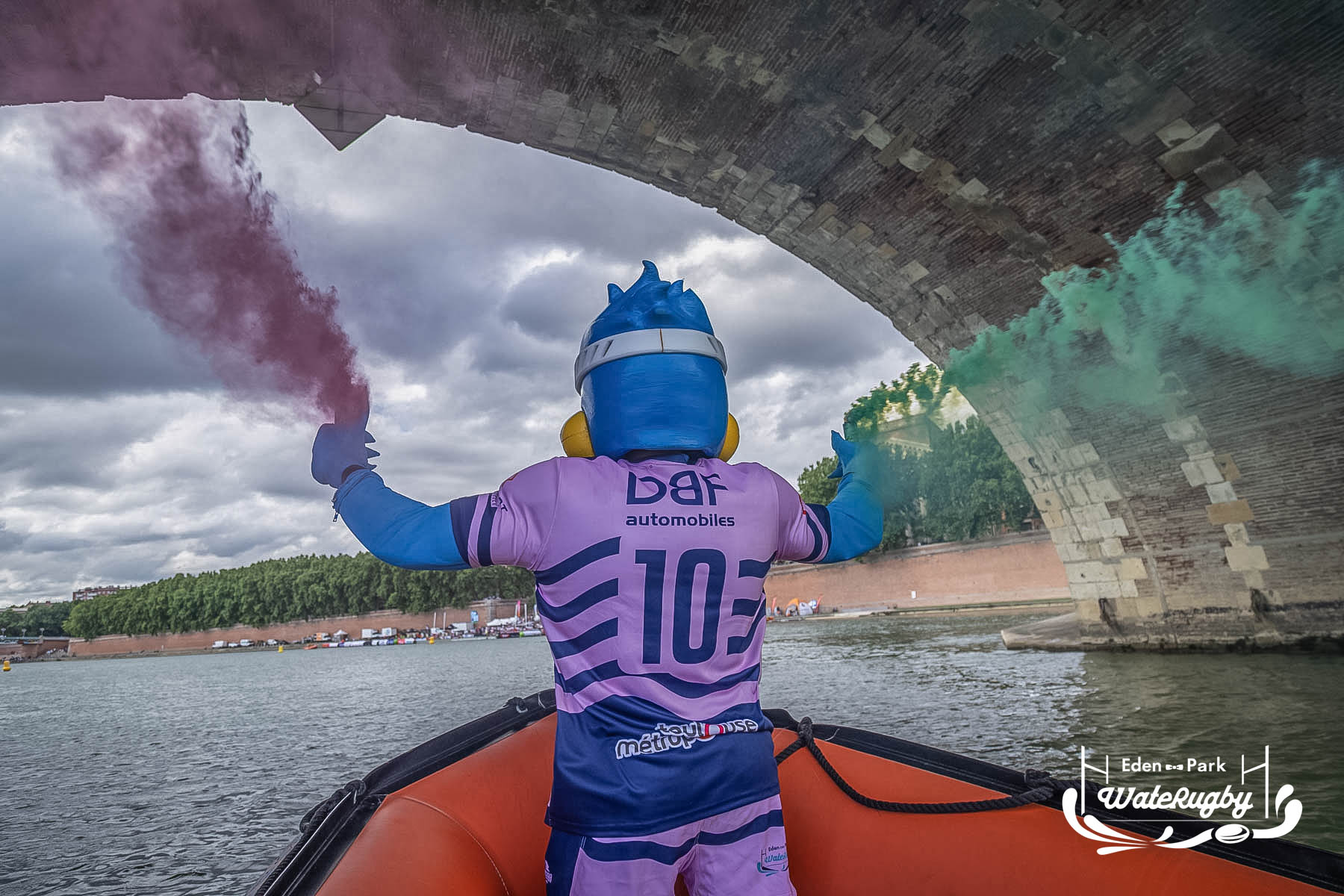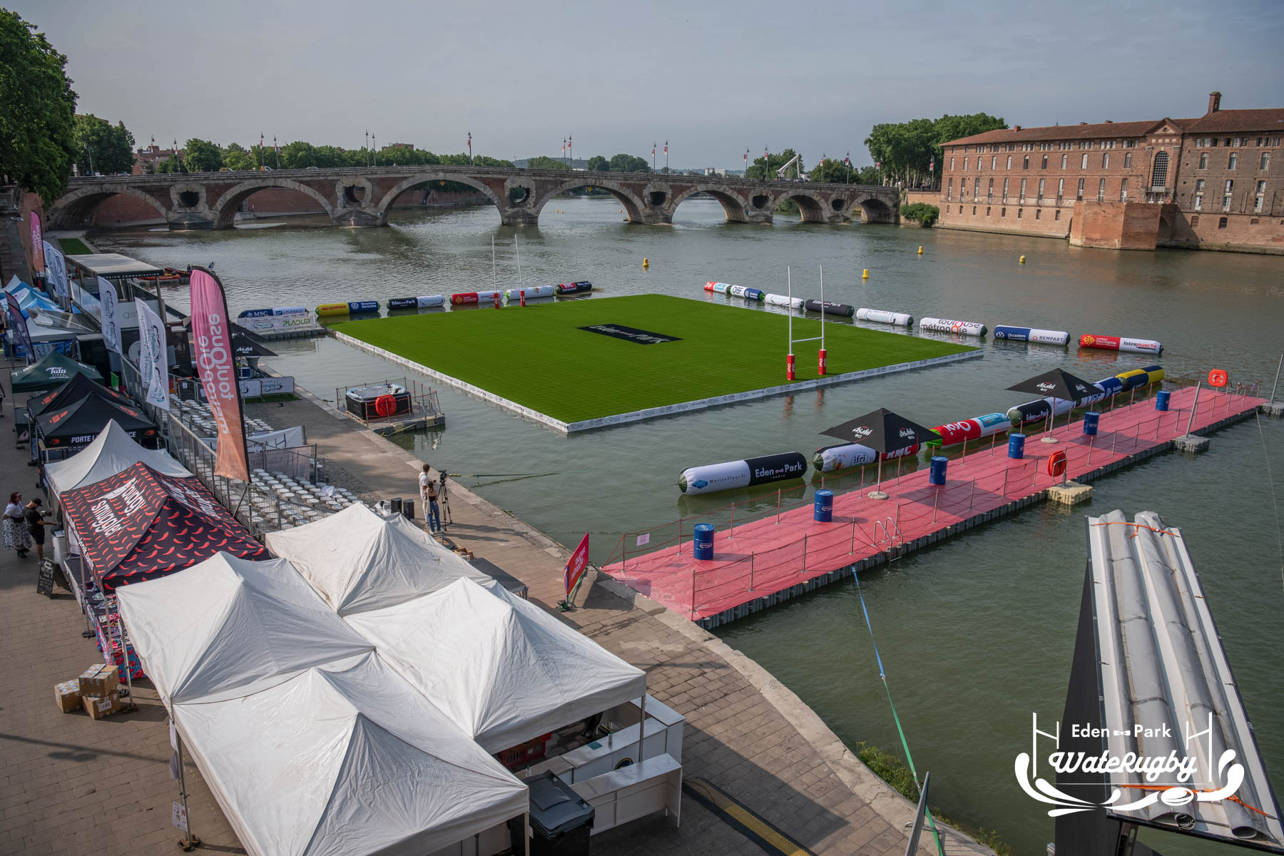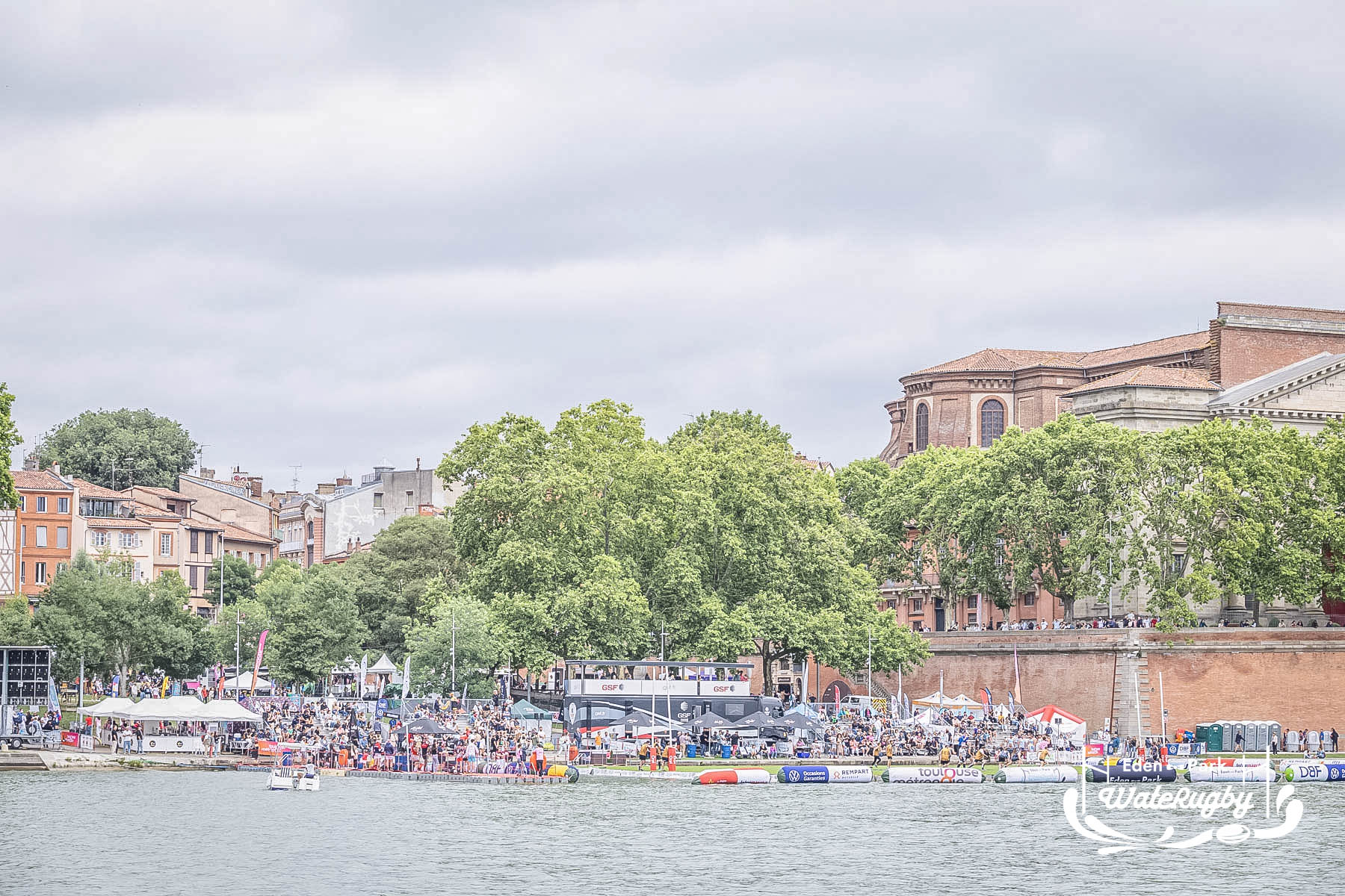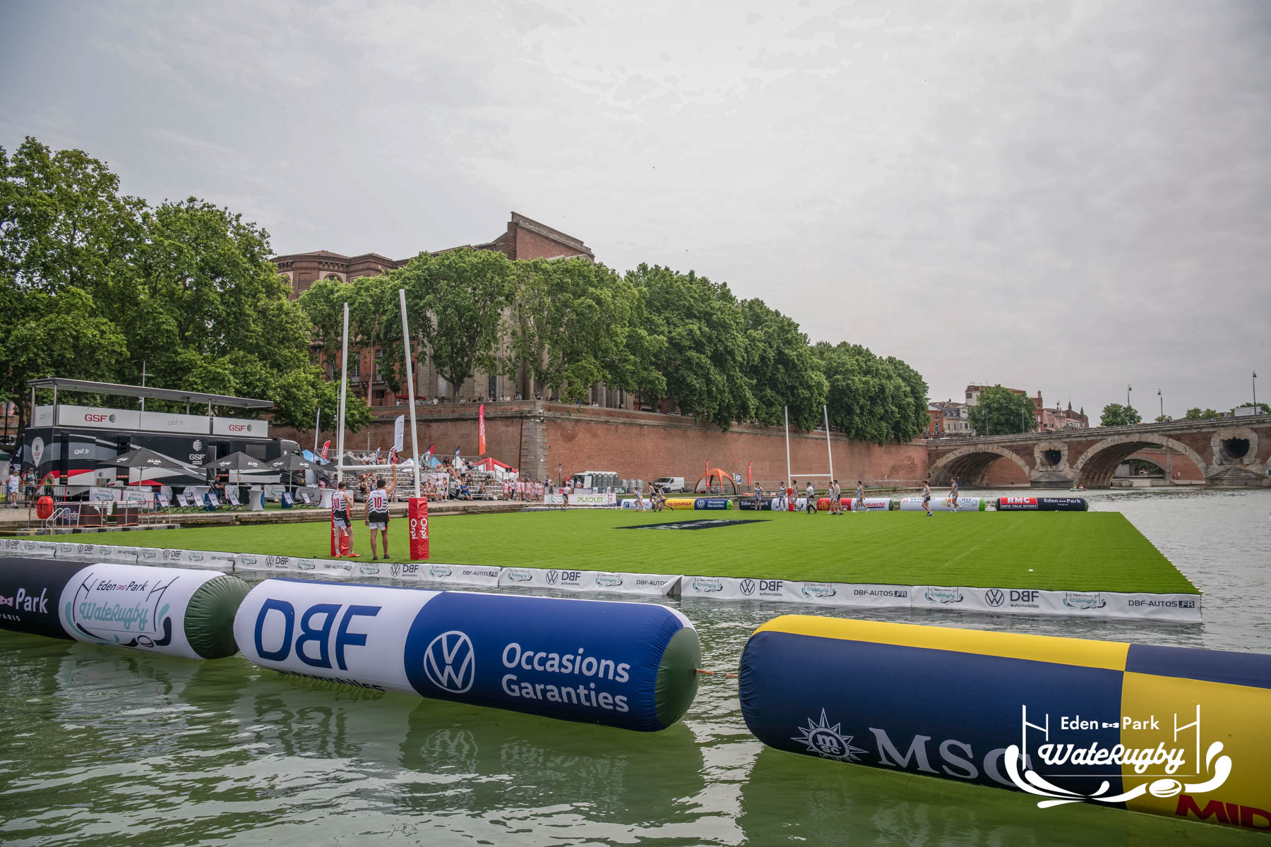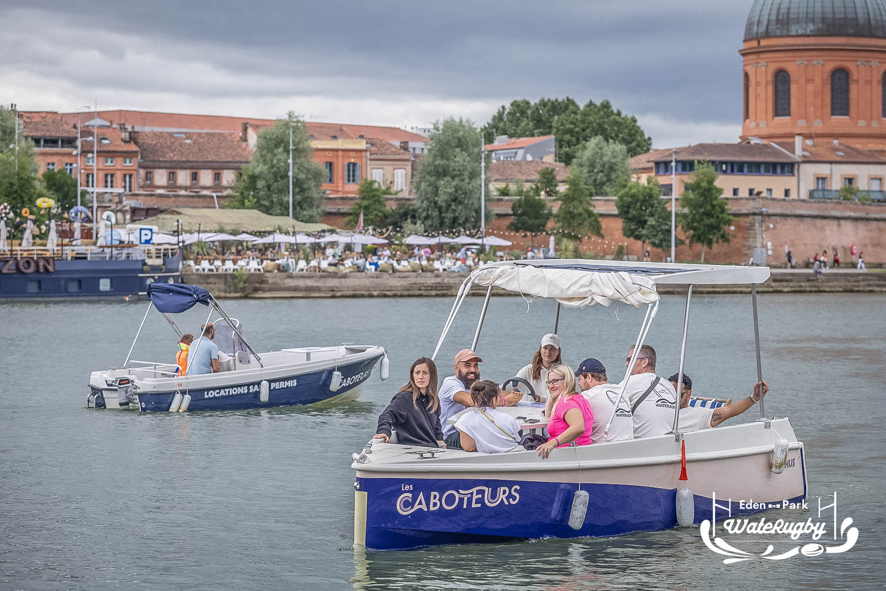 Compétition de rugby sur une barge sur la Garonne en plein centre de Toulouse