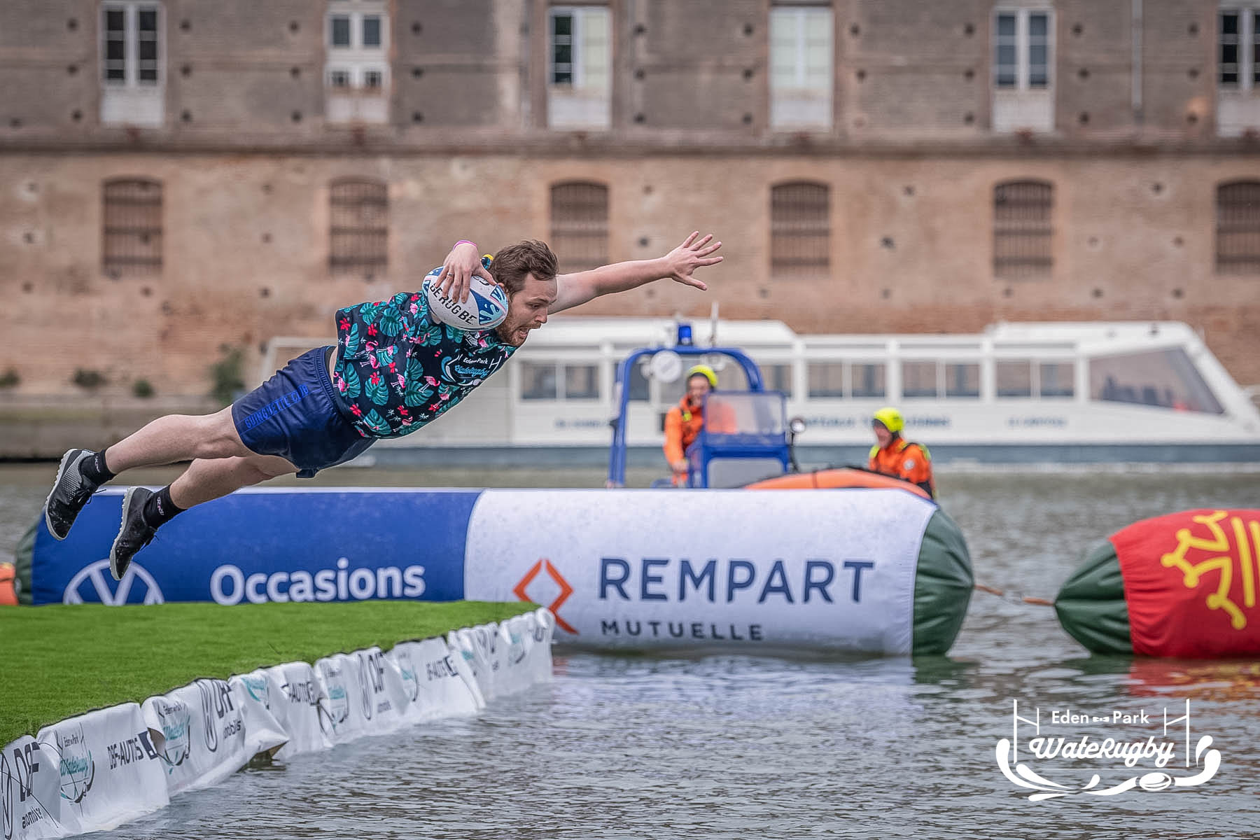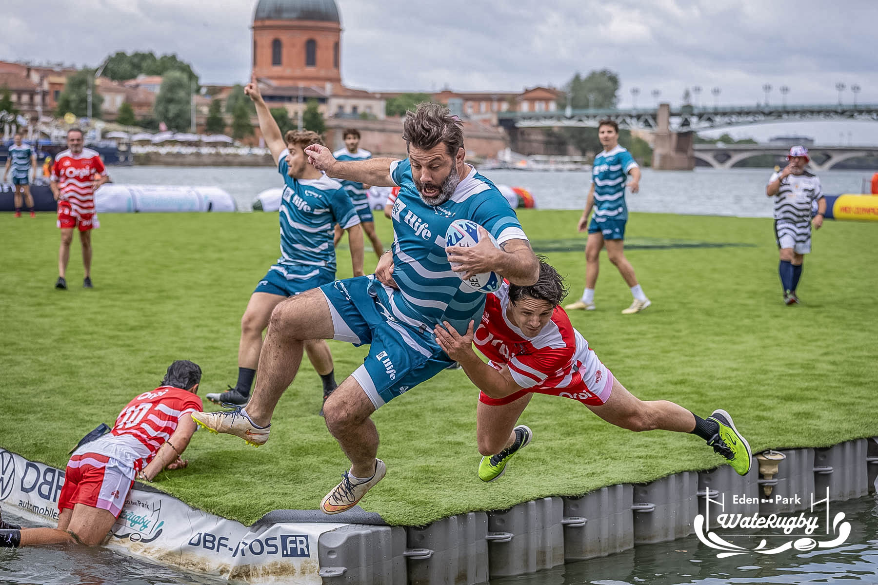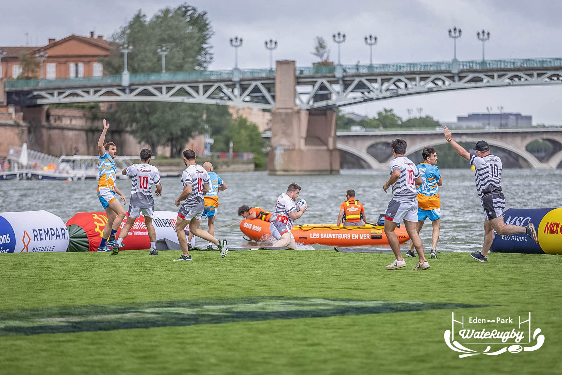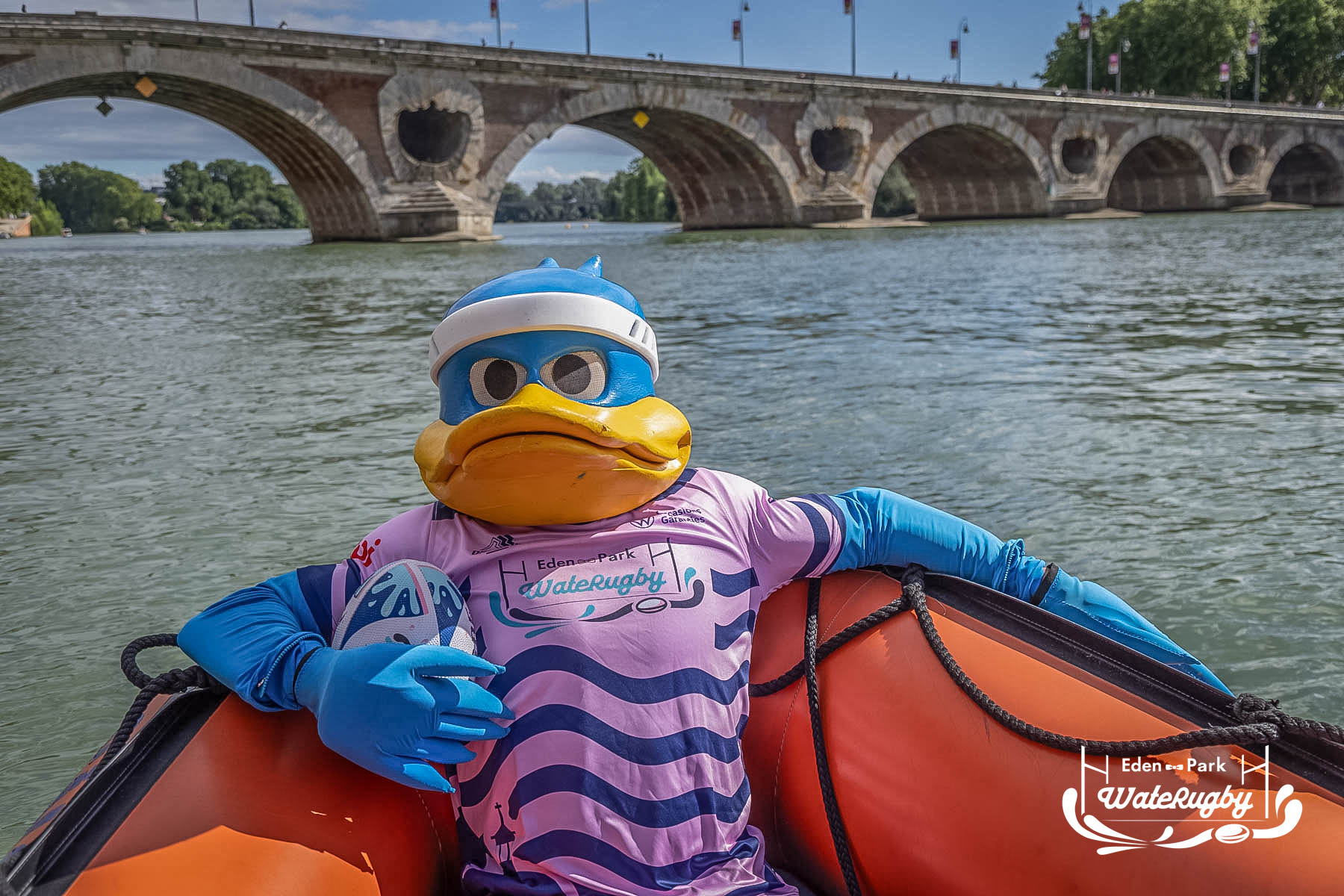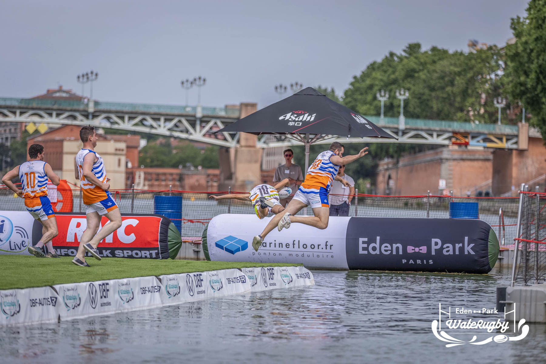 Compétition de rugby sur une barge sur la Garonne en plein centre de Toulouse