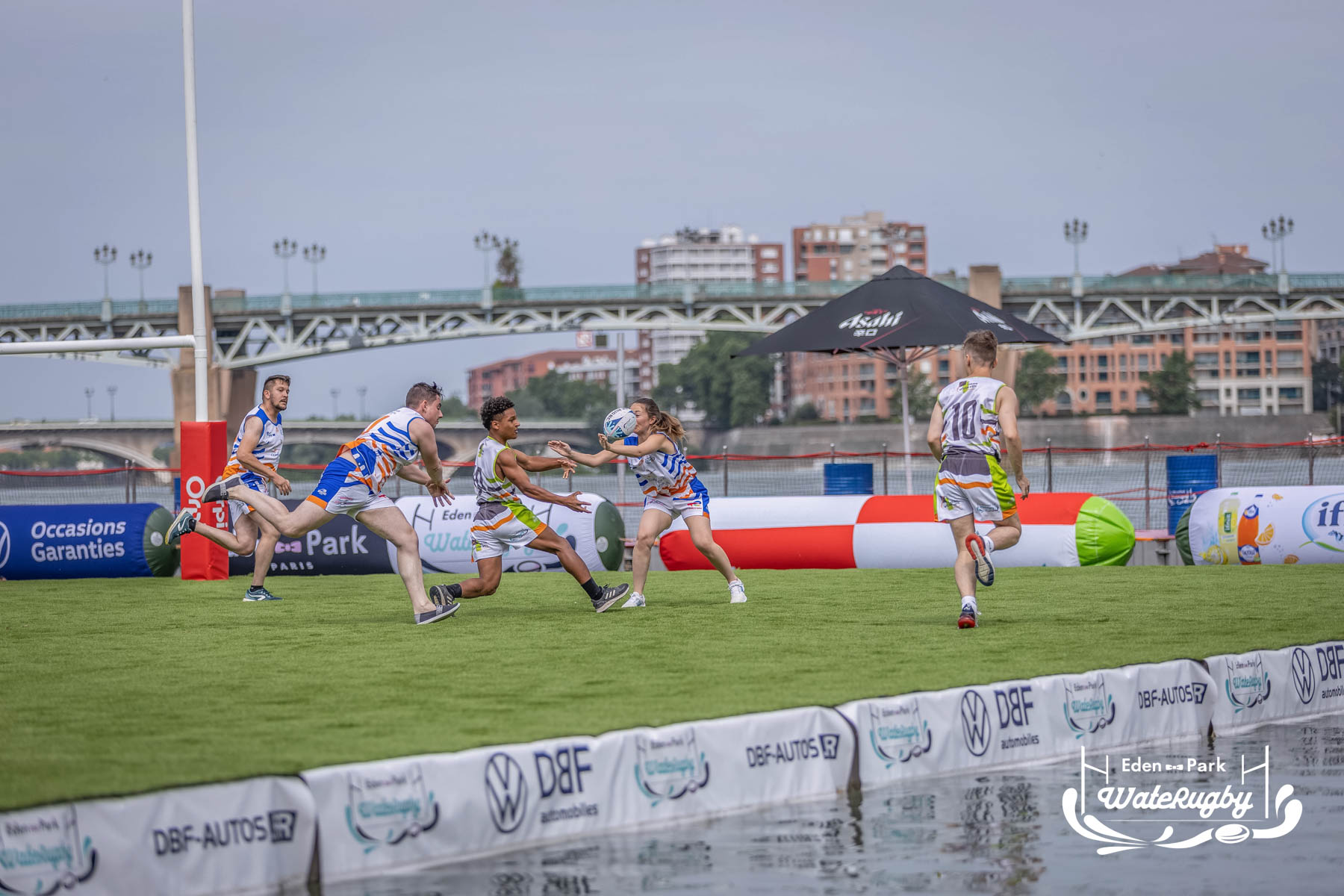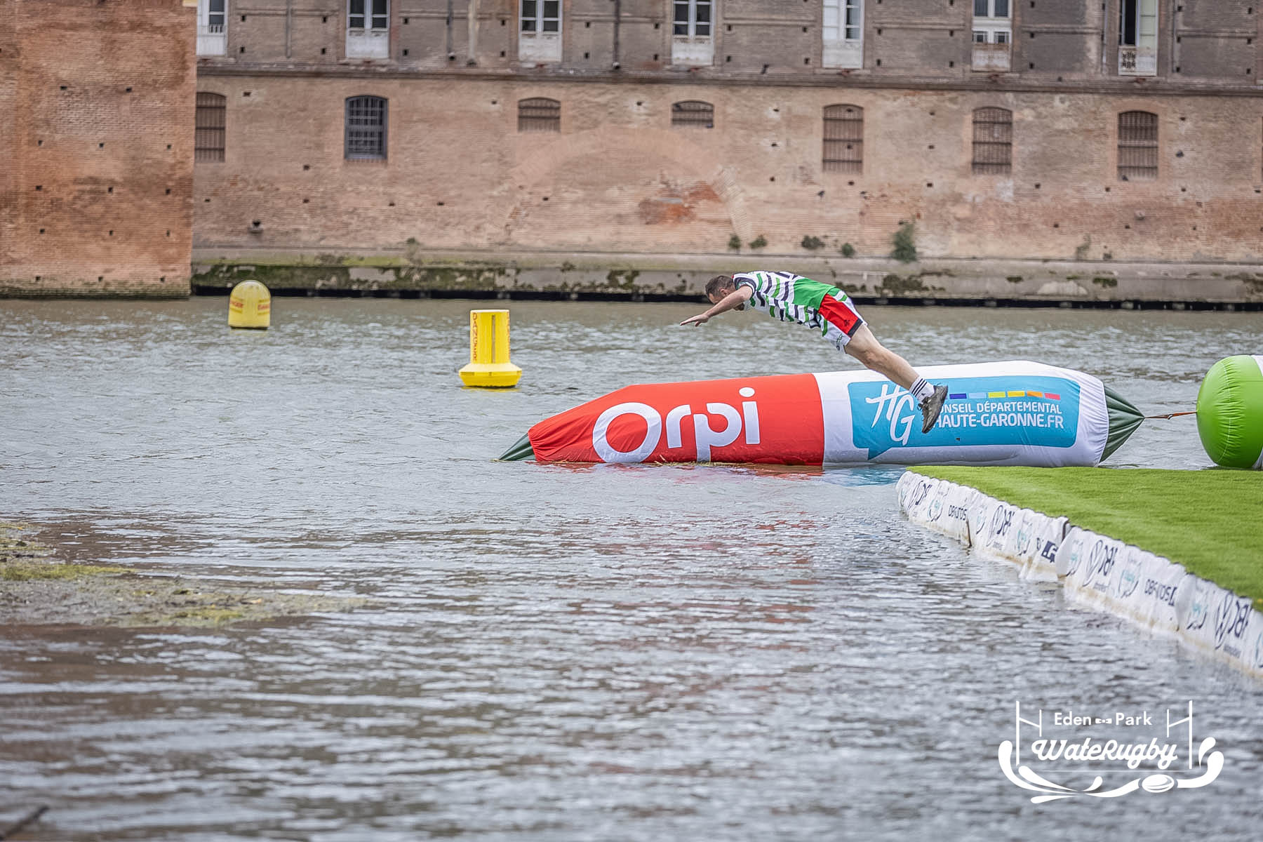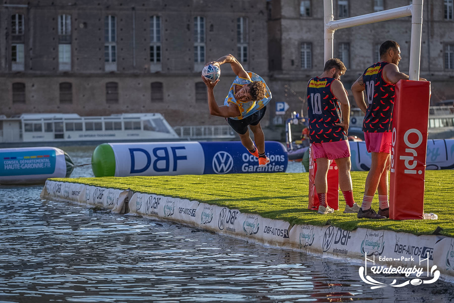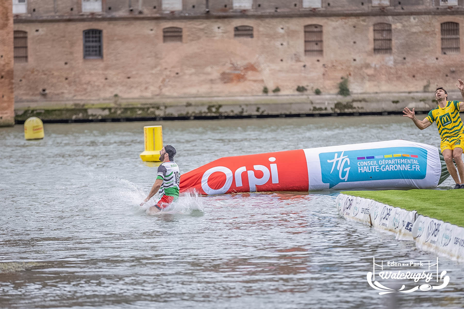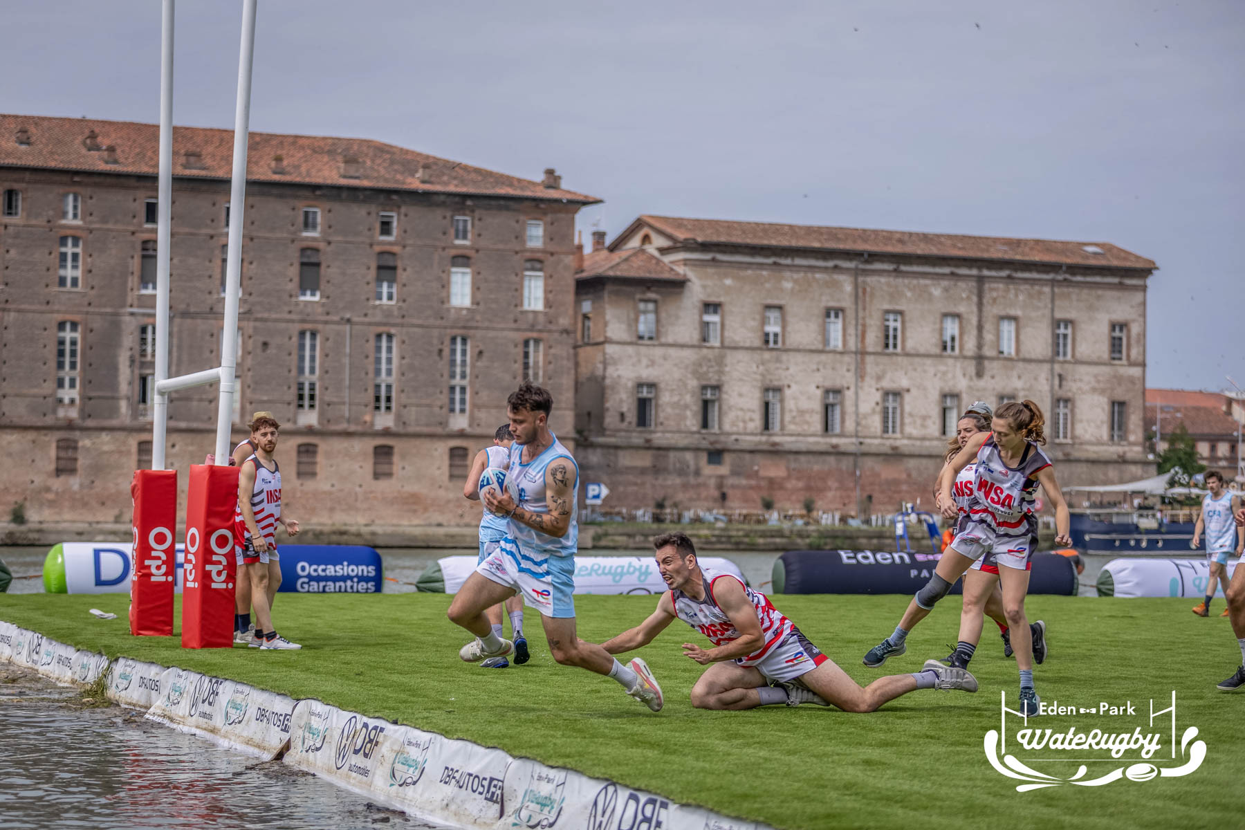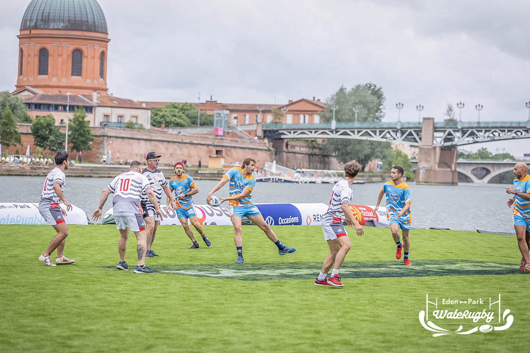 Compétition de rugby sur une barge sur la Garonne en plein centre de Toulouse