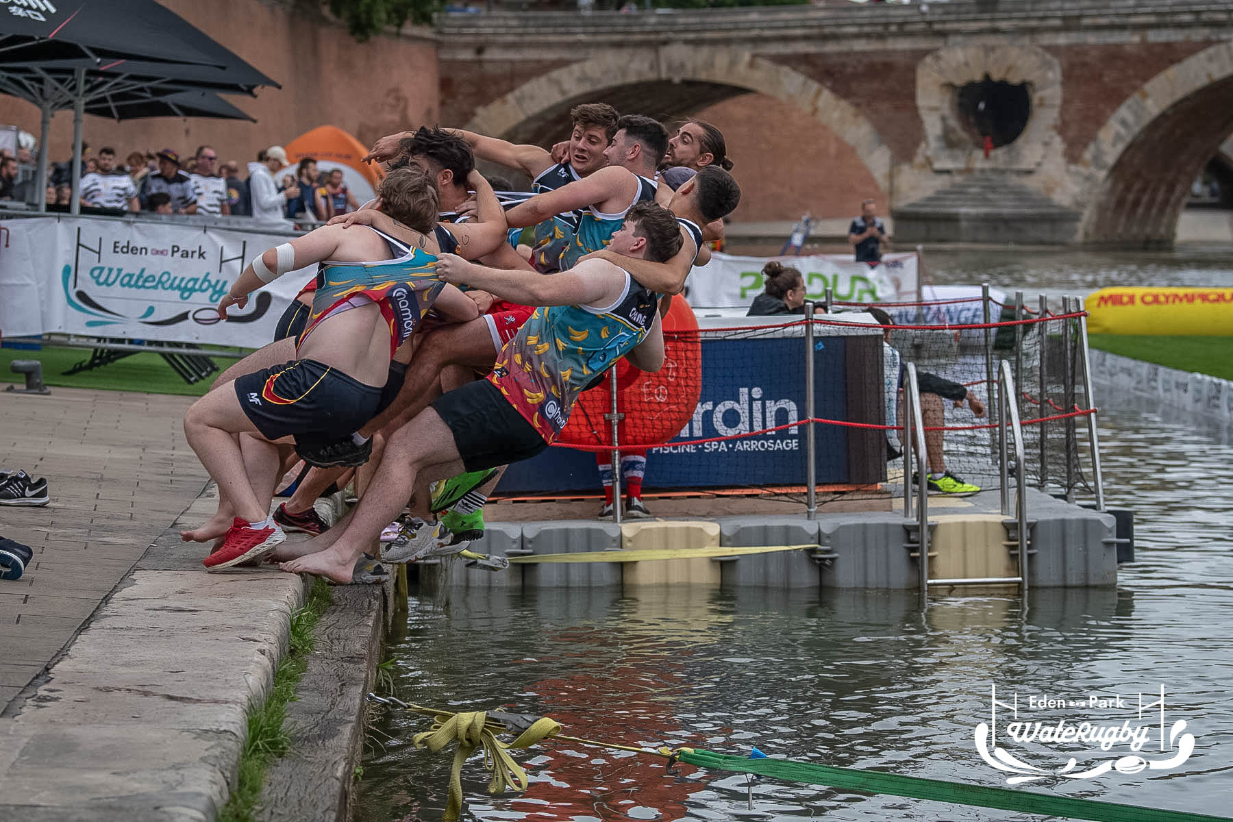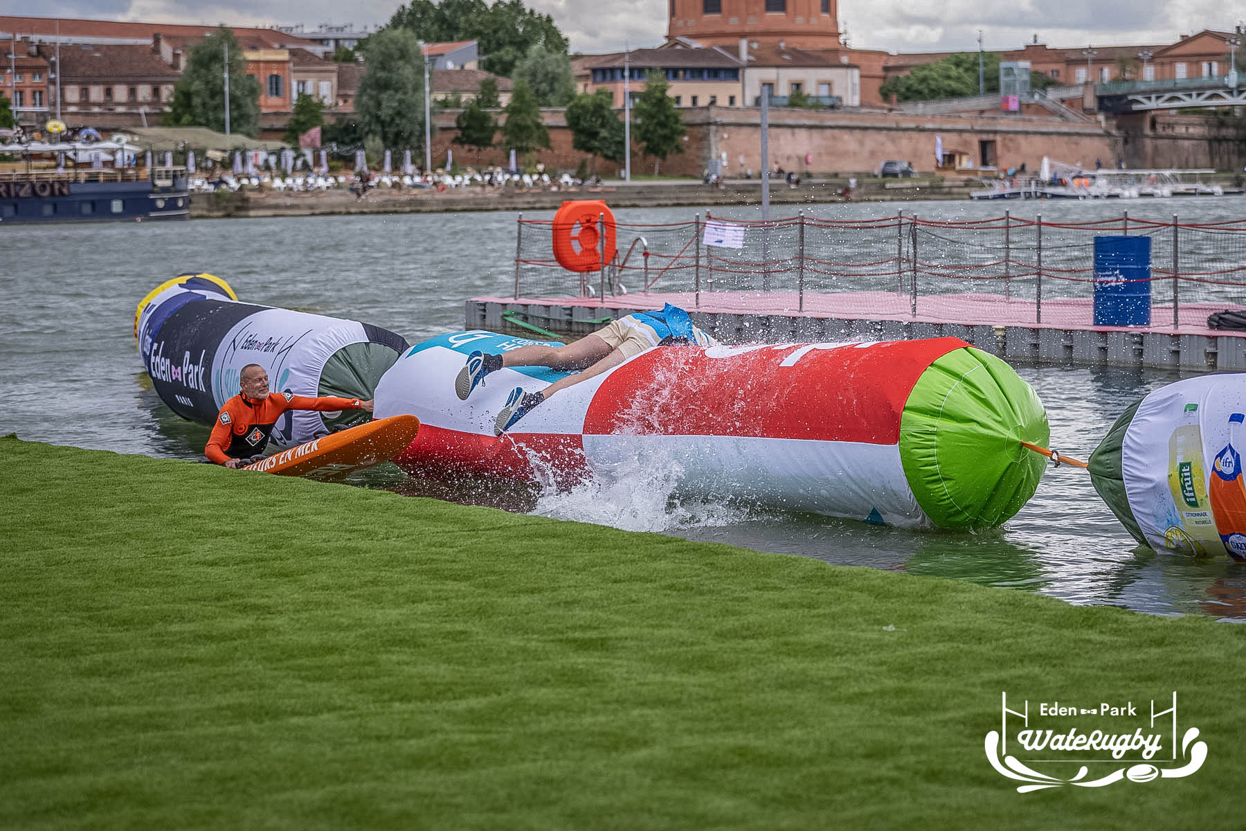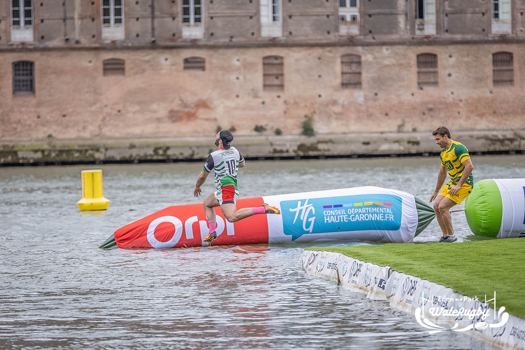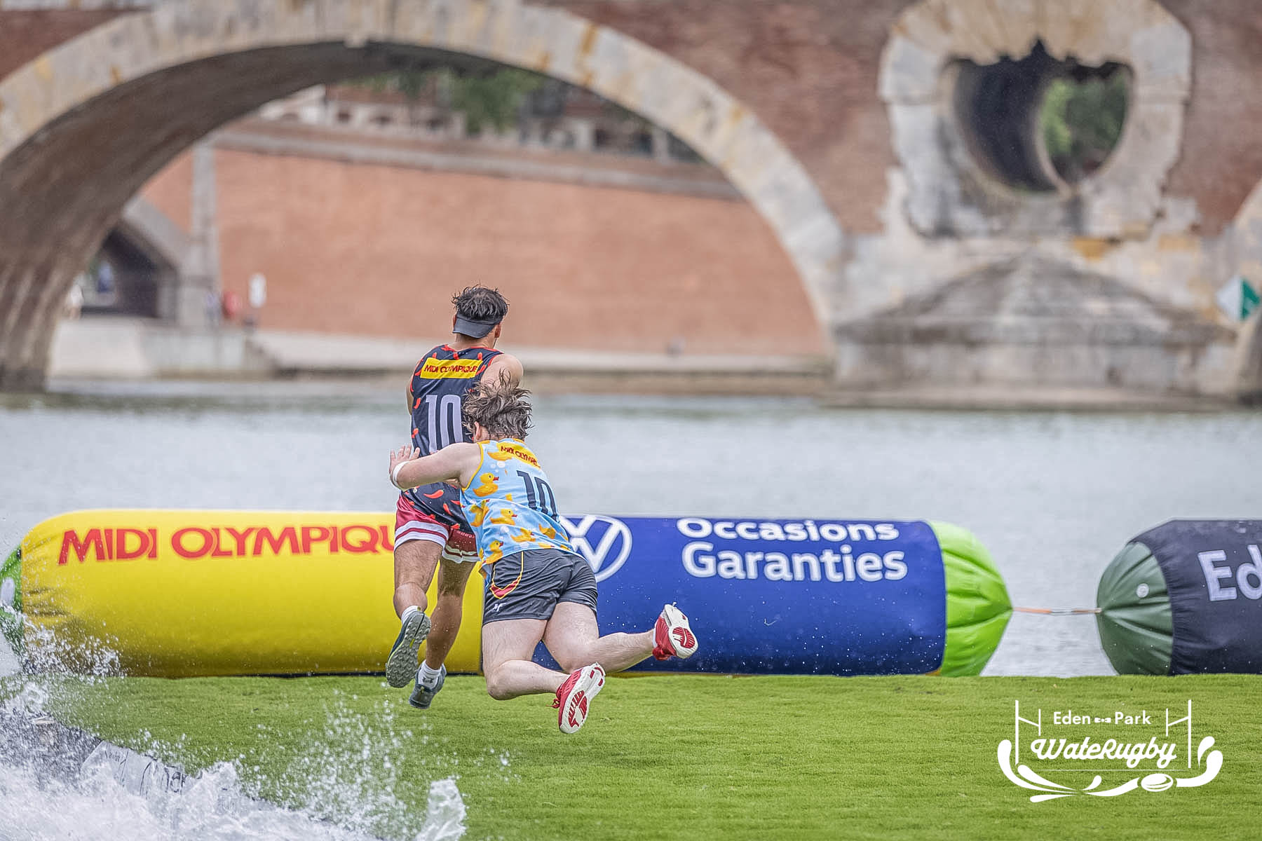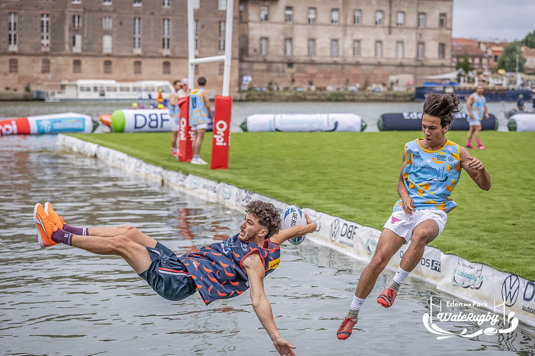 Compétition de rugby sur une barge sur la Garonne en plein centre de Toulouse