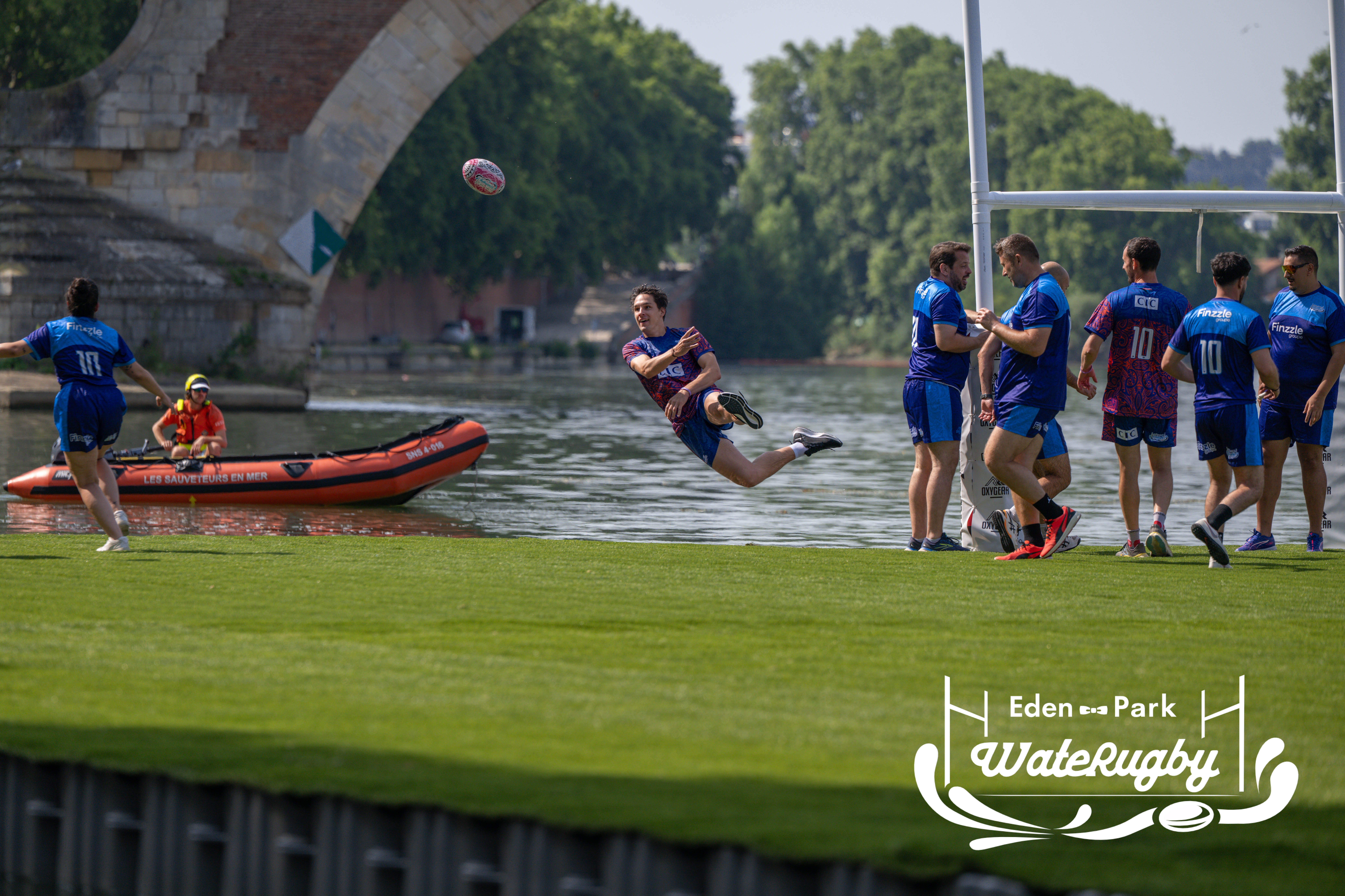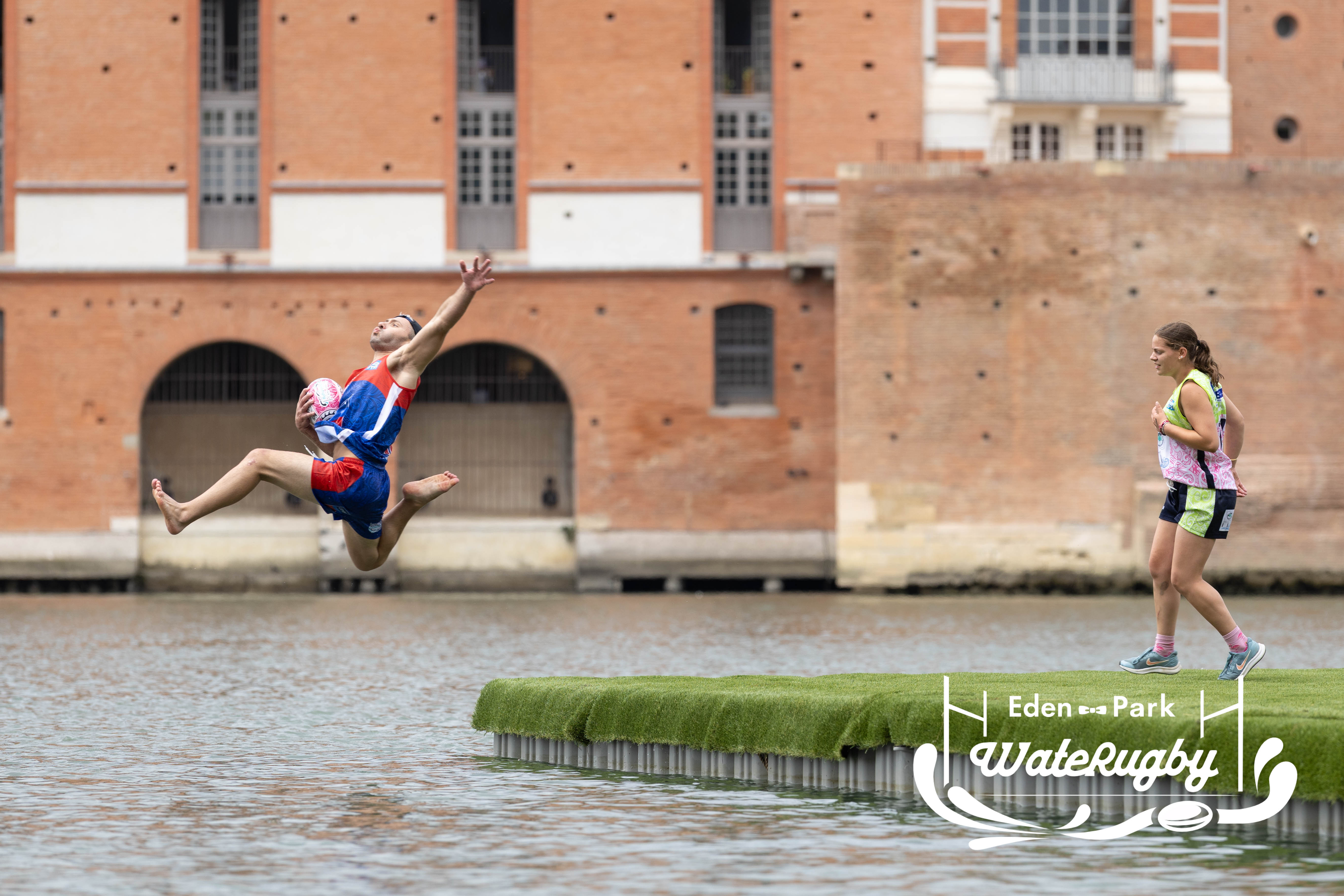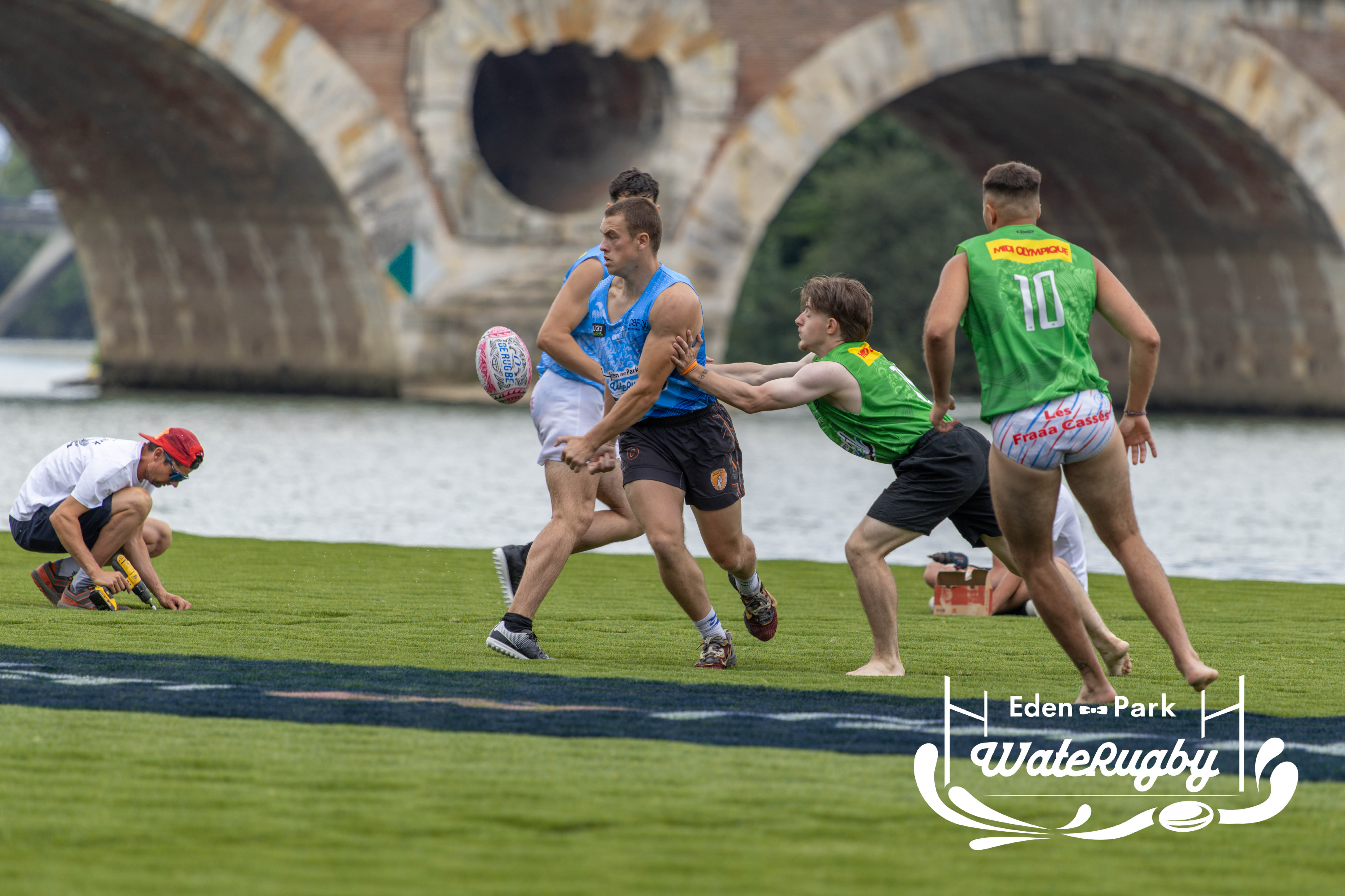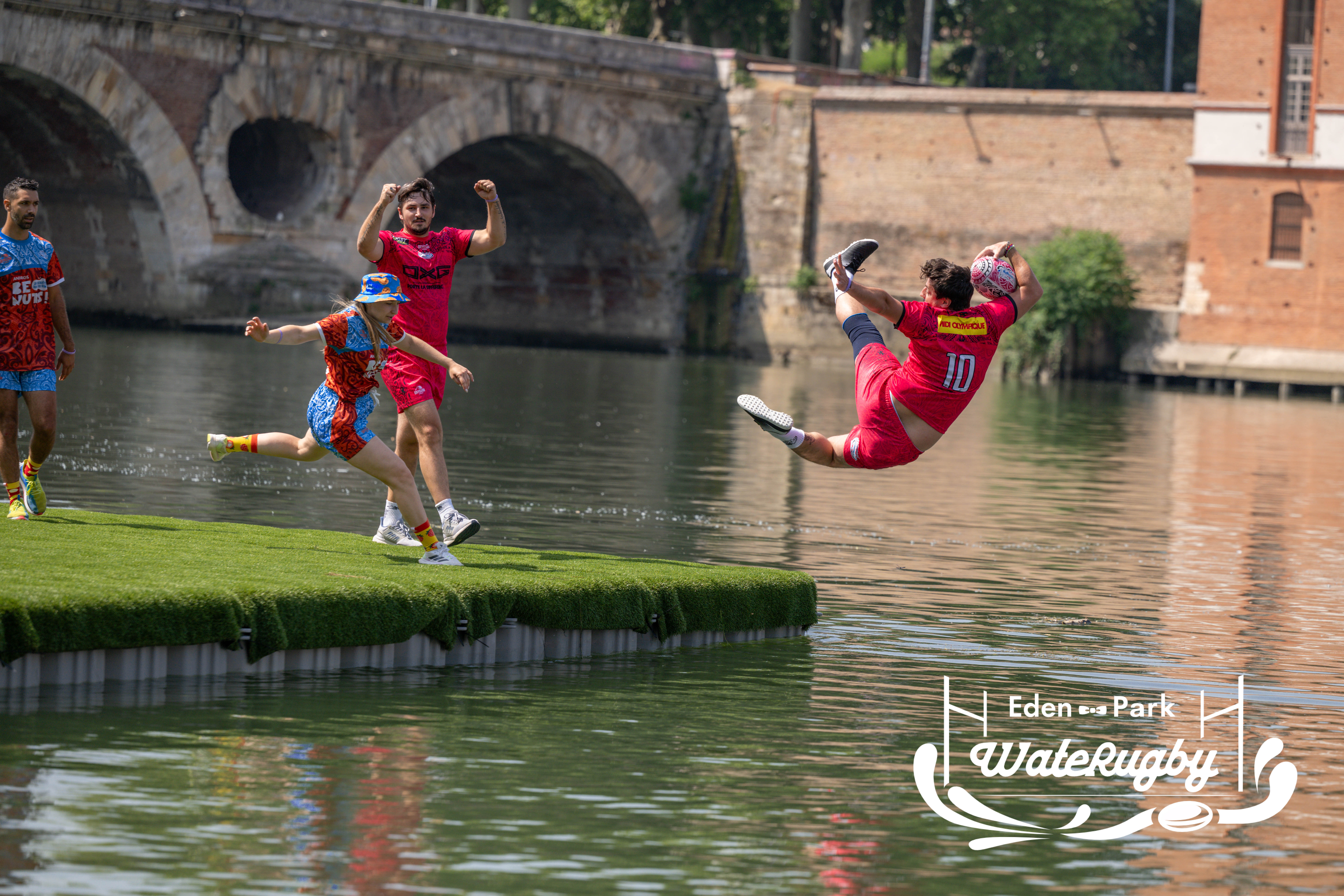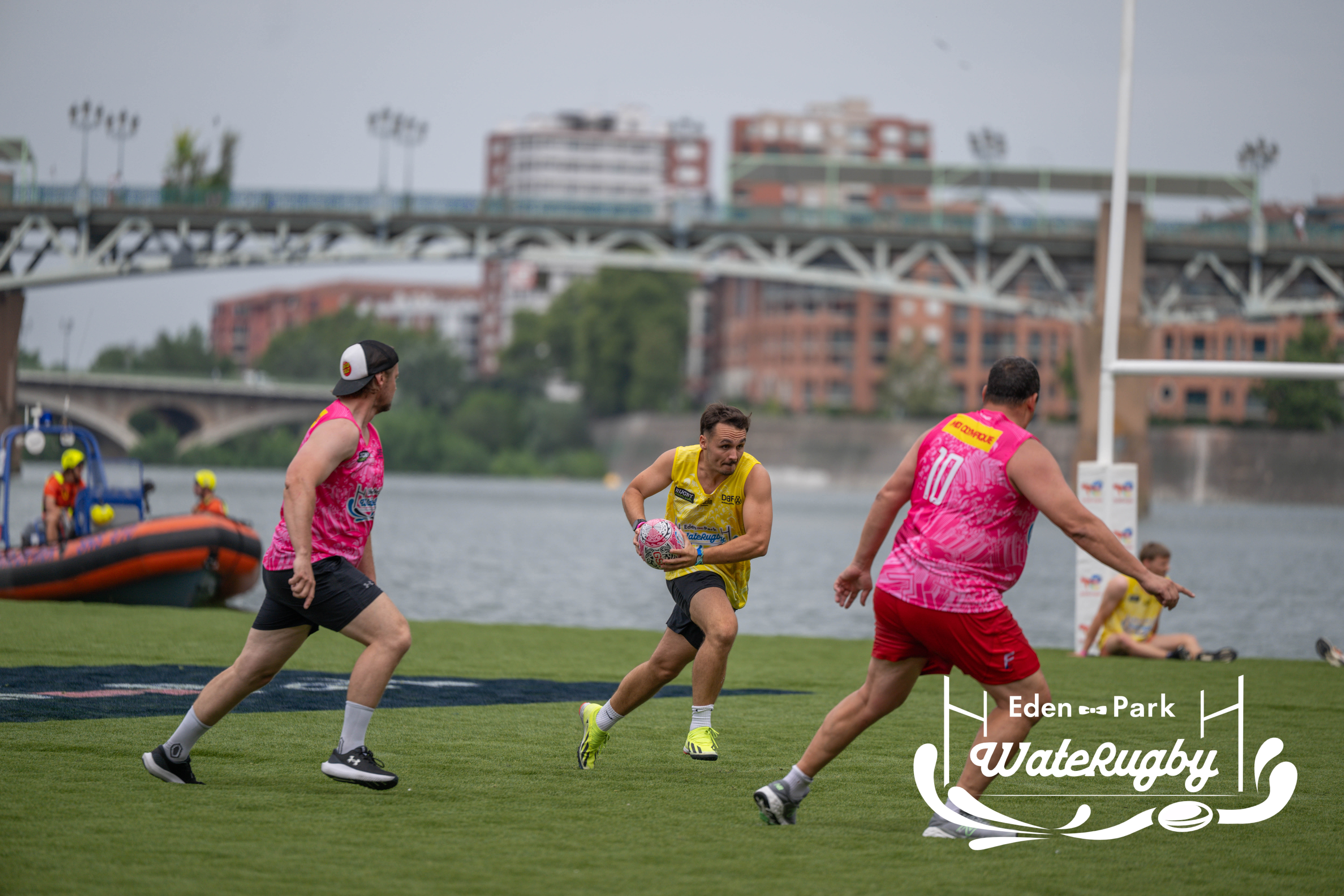 Compétition de rugby sur une barge sur la Garonne en plein centre de Toulouse